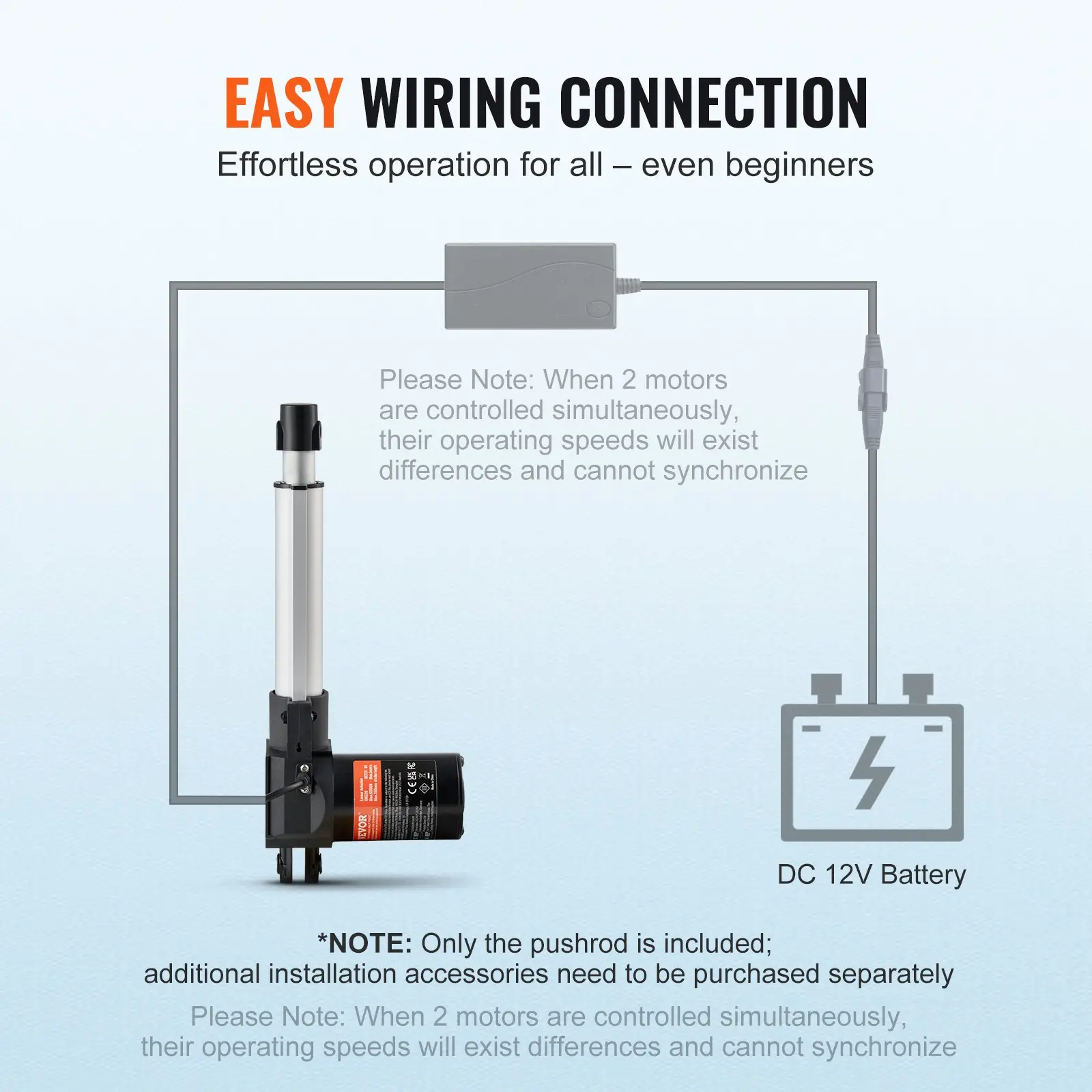 Heavy-Duty Applications: VEVOR heavy duty linear actuator boasts 1320lbs/6000N powerful torque output, perfect for industrial automation and heavy-duty lifting system.It's designed to tackle high-torque and heavy-load tasks with ease, providing reliable performance in demanding environments.Durable Construction: Reinforced design and an all-metal transmission mechanism ensure reliability even under high loads, making it suitable for a wide range of industrial and home automation applications.It's built to withstand long-term use and provide dependable operation.Versatility Unleashed: Get ready for a quiet revolution!VEVOR's linear motion actuators, with a noise level below 50db, are your go-to for furniture adjustment, automation systems, mechanical equipment, transportation and more.Enjoy seamless functionality wherever you need it!IP44 Protection Rating: Featuring an IP44 protection rating, VEVOR 12V linear actuator excels in environments with dust, solid particles, and light-splashing water.Count on it to withstand dust and moisture in general industrial and household applications.(Caution: Water should not penetrate the interior of the motor)Key Specifications: Stroke Length: 6 inch (150mm); Travel Speed: 0.19 in/s (5mm/s); Retracted Length: 14.17" (360mm); Extended Length: 20.17" (510mm); Current Draw: 8amps; Rated Voltage: DC12V; Duty Cycle: 10%.VEVOR Linear Actuator 12V, 6 Inch Heavy Duty 1320lbs/6000N Linear Actuator, 0.19"/s Linear Motion Actuator with Mounting Bracket & IP44 Protection for Electric Door Industrial Machinery Vessels Cargo