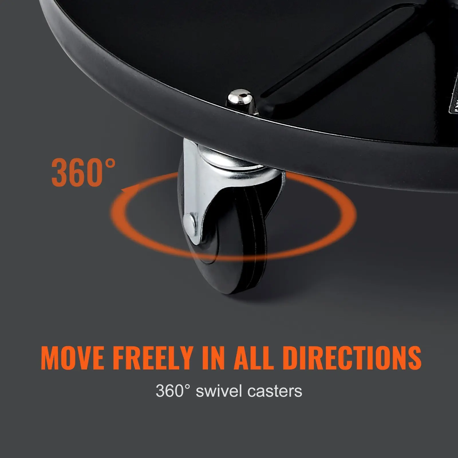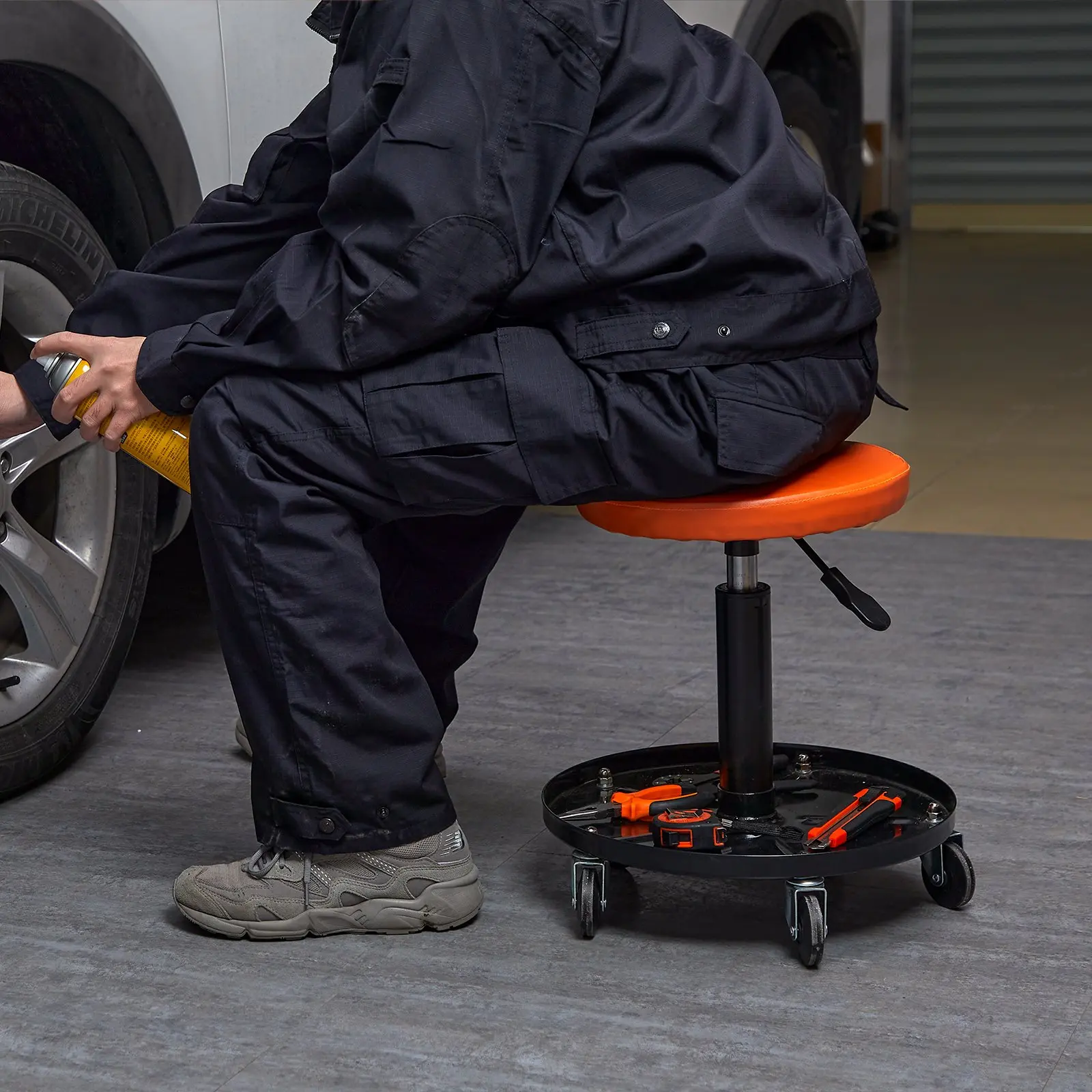 Achieve the Perfect Height: You can adjust the garage stool’s height from 16" to 22"/406 mm to 559 mm through the rod according to your height and body type.Save yourself the trouble, and stop bending over!Adjusting the height to a suitable position while working has never been easier!250 LBS Capacity: Adopt high-quality pneumatic cylinder, which has a strong bearing capacity and is not easy to deform after long use.The seat is firm, and the casters are fixed firmly with locknuts and thread glue.Put your worries aside and have a seat.The center of gravity is stable, making it difficult to tilt and preventing falls.Organize Your Space: The tool tray is made of iron, making it resistant to the impact of sharp tools; it features compression and wear resistance.With the large steel tool tray, you can organize your equipment in order and keep them within reach.Put a storage compartment inside the footrest!Move with Ease: Comes with everything you need!Equipped with 5 pcs 2.5"/6.35 cm 360° universal casters, the workshop stool can be flexibly steered even on complex surfaces.Ball-bearing PP casters feature a compression mechanism and are wear-resistant.Smooth movement on different surfaces.Broad Applications: The wide padded seat allows you to work longer while sitting for hours.The garage stool is perfect for repairing or cleaning vehicles, furniture, and other low projects.Lightweight design allows you to use it anywhere you need, such as garages, roadsides, homes, etc.Work anywhere, comfortably!VEVOR Mechanic Stool, 250 LBS Rolling Pneumatic Creeper Garage/Shop Seat, Adjustable Height 22 in-28 in Padded Rolling Workshop Stool with Tool Tray, for Garage, Shop, Auto Repair, Black+Orange
