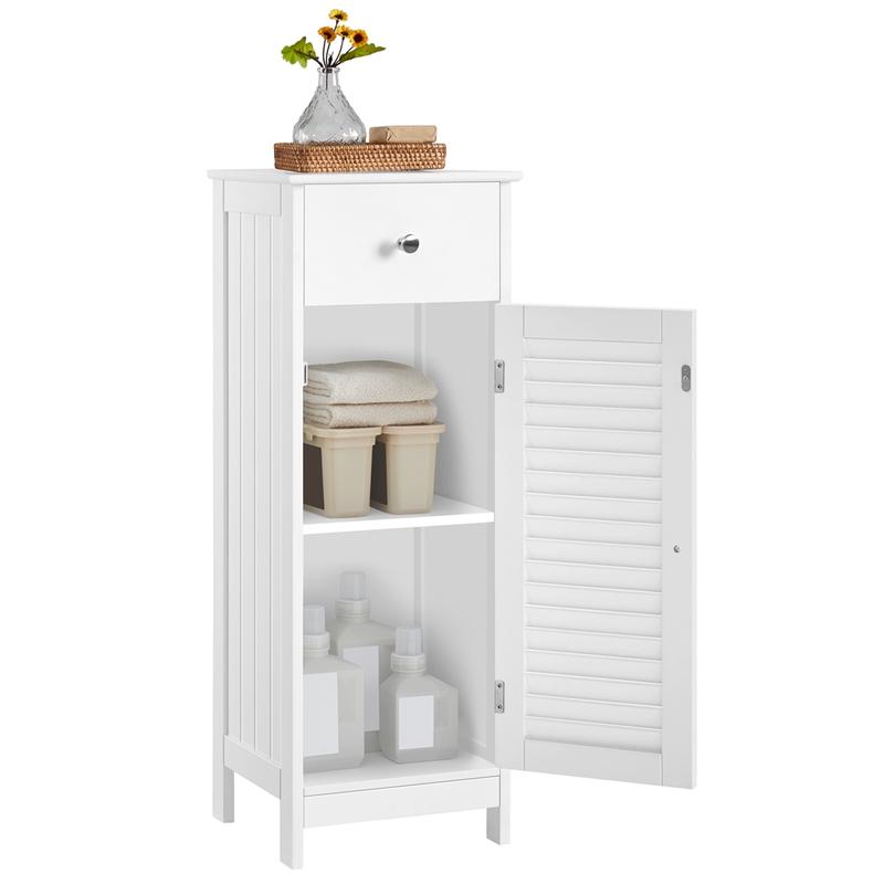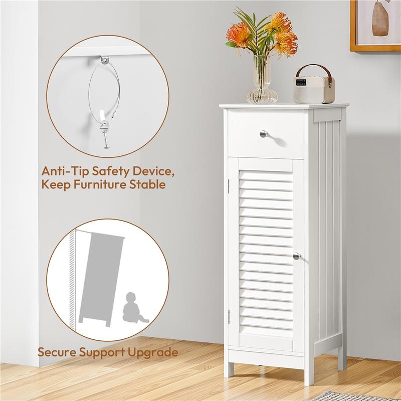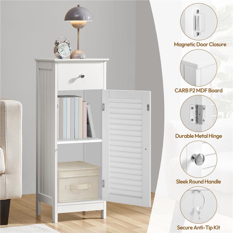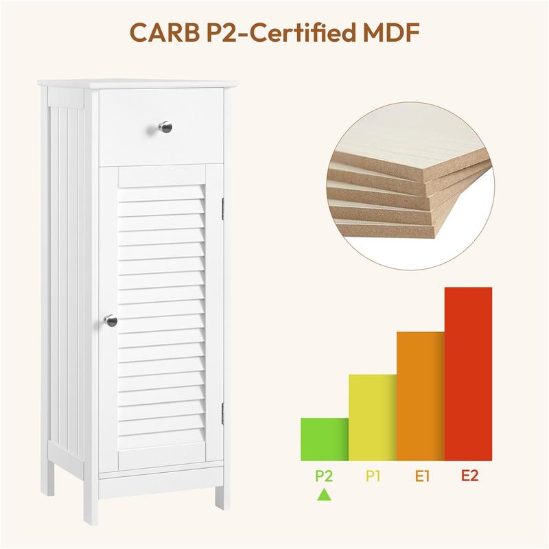 Imagine a bathroom where every item has its ideal spot. Our 34.5″ tall bathroom cabinet is the ideal fit. At just 13″ wide, it slides seamlessly into tight spots beside your vanity or toilet, transforming wasted space into a sleek storage nook. Crafted with durable, easy-clean CARB P2 MDF, this freestanding storage cabinet requires no complex installation. The single door and smooth drawer offer the ideal mix of hidden and accessible storage — tuck away supplies inside and keep daily essentials within arm's reach. Its clean design and sturdy build make it a practical and stylish upgrade for any bathroom, helping you conquer clutter without sacrificing precious floor space.