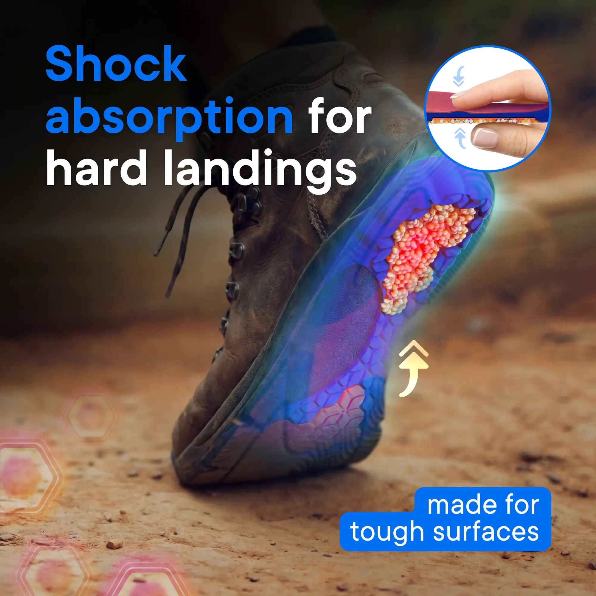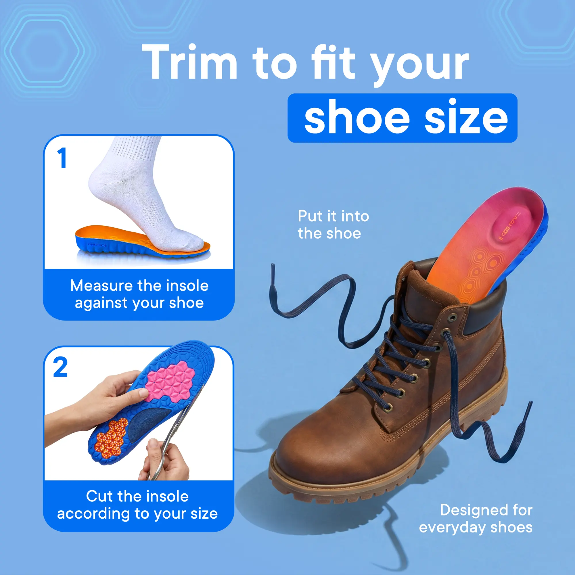 Works in sneakers, work boots, and everyday shoes. Remove your old insole insert CloudCush trim to fit if needed.