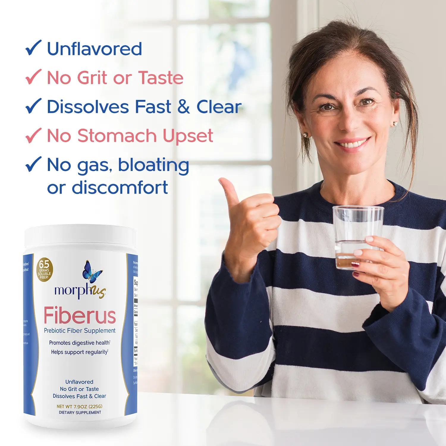 Fiberus is a prebiotic fiber with 6.5g of fiber per serving to support digestive balance, gut health, and regularity during perimenopause and menopause. Prebiotics feed the good bacteria in your gut, promoting healthy gut flora, digestive health, and overall wellness.