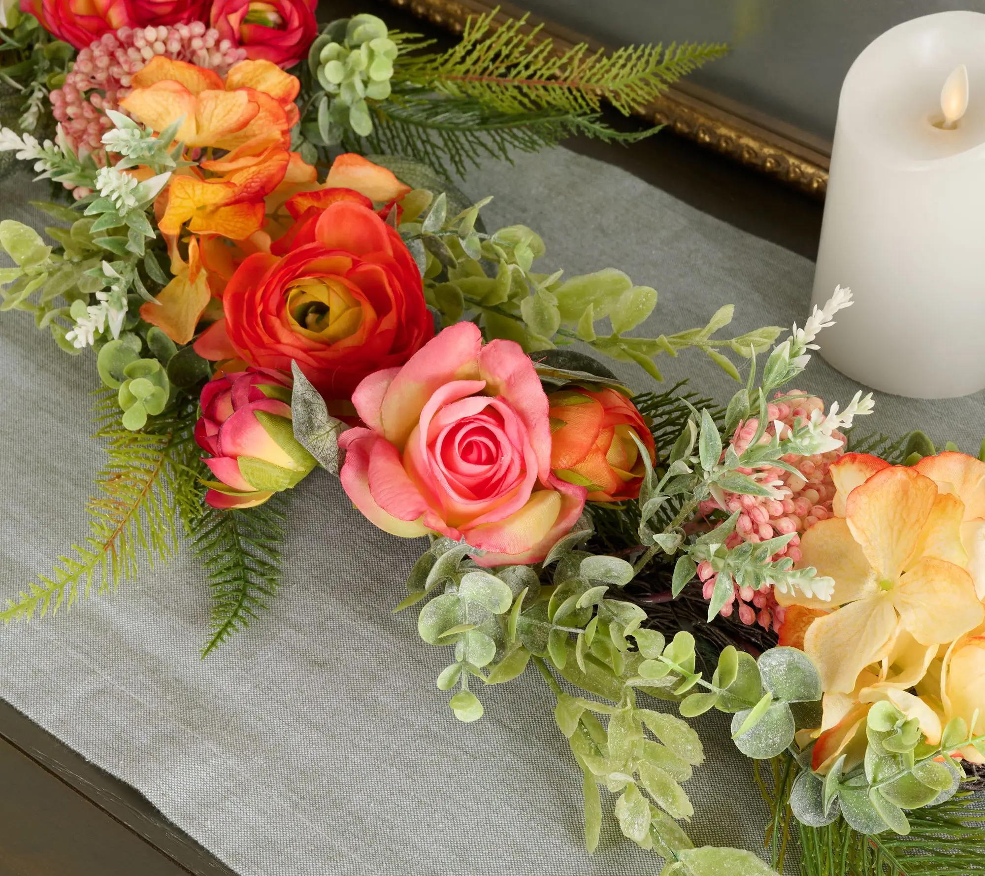 This lovely garland measures 5' long. It is overflowing with faux ranunculus, rose, hydrangea and sedum all intermixed with green leaves and eucalyptus. The garland has a grapevine base and loop for hanging if desired. For indoor decorative use only. Imported. From The Valerie Parr Hill Collection.