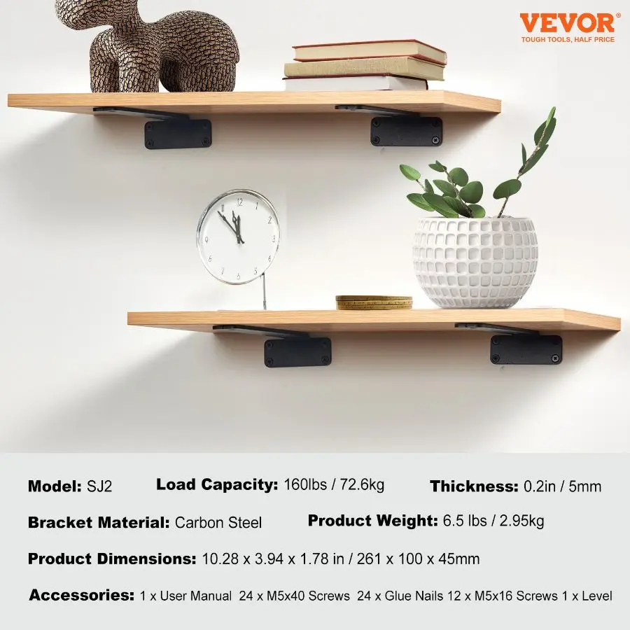 VEVOR Shelf Bracket, 12Lx 4Wx 1.6H 6 Pcs, Heavy Duty Floating Shelf Brackets, Brackets for Shelves, 5mm Thick Matte Black L Shelf Bracket, Steel Shelving Brackets with 160 lbs Load CapacityVEVOR Shelf Bracket, 10”L x 4”W x 1.6”H, 6 Pcs Heavy Duty Floating Shelf Brackets, Brackets for Shelves, 5mm Thick Matte Black L Shelf Bracket,Steel Shelving Brackets with 160 lbs Load Capacity