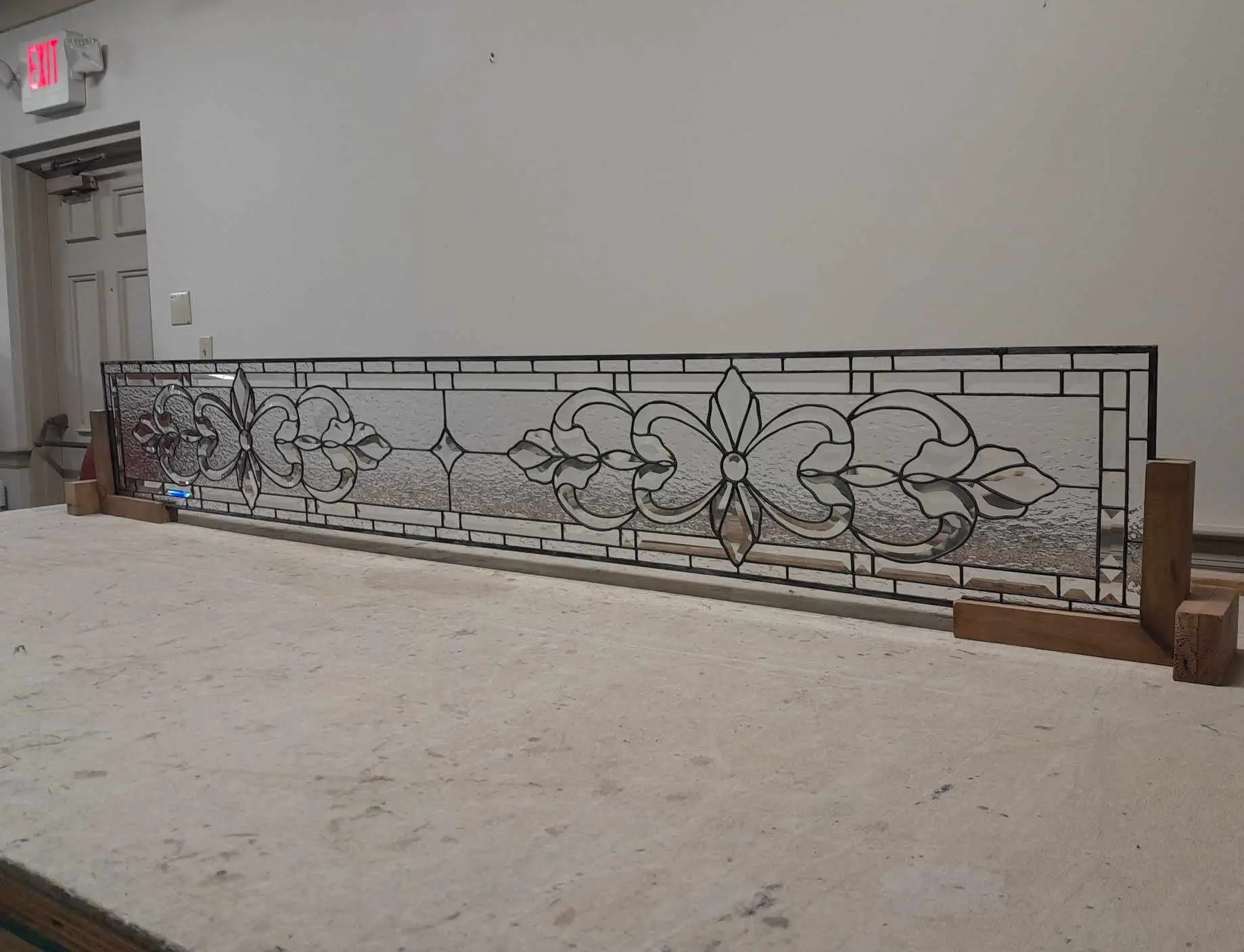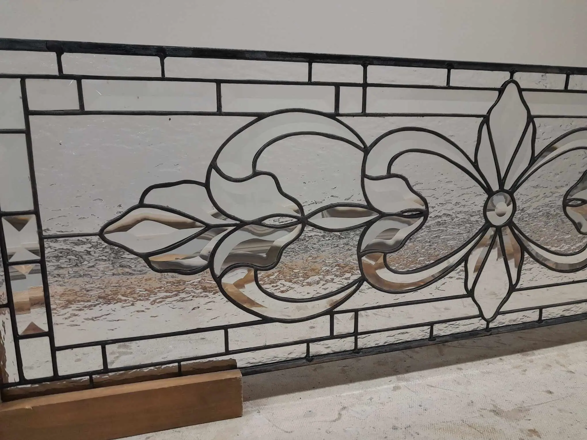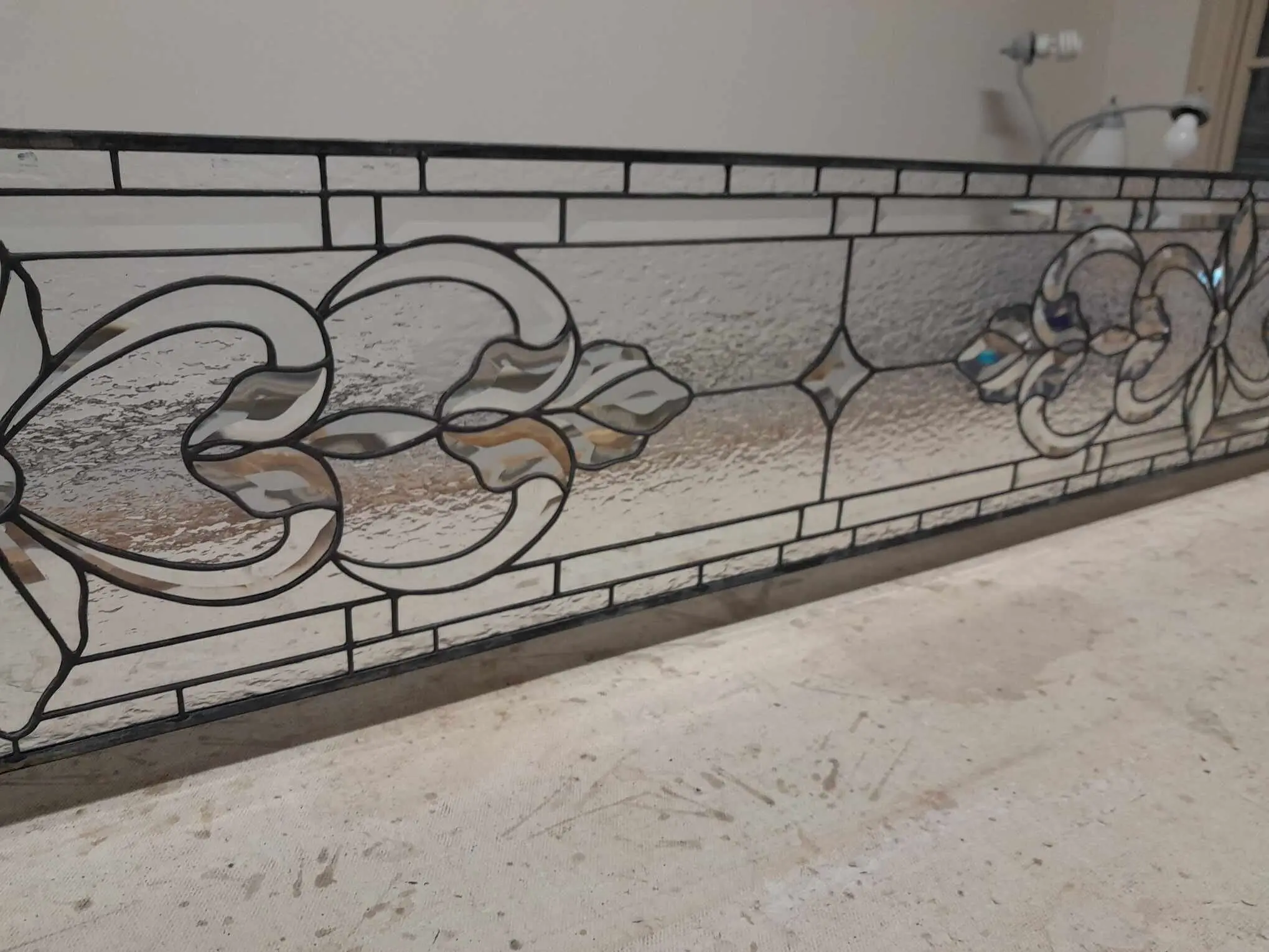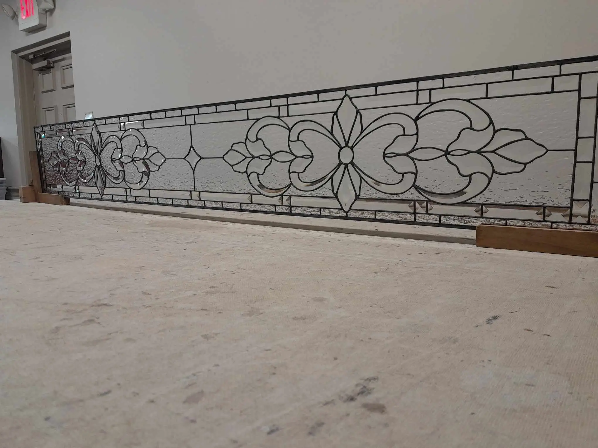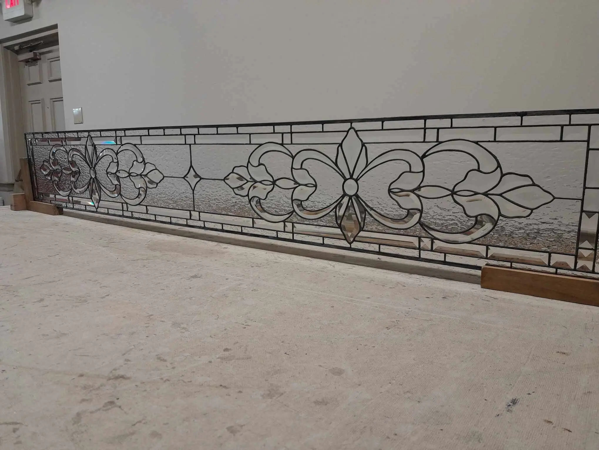 Elevate your interior with the regal charm of this artisan-crafted clear glass masterpiece. This horizontal panel showcases breathtaking symmetry with its flowing scrolls and stylized botanical silhouettes. By utilizing a variety of high-obscurity textures—from hammered patterns to frosted ripples—this piece creates a dazzling interplay of depth and dimension. The crisp, charcoal-black leading provides a bold, structural contrast to the transparent elegance of the glass. Ideal for a stately transom, room divider, or wide sidelight, it brings a palatial aesthetic to any custom home project.