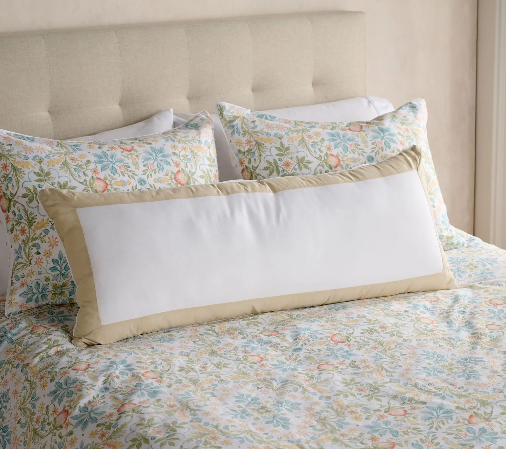 Bolster pillow measures 16 x 40 and features a beautifully pieced border frame. It is crafted with a 100% Cotton Wonderweave Soft fabric shell and filled with 100% polyester for comfort and durability. The pillow is available in 5 elegant colors: Tan, Light Blue, Lilac, Aqua, and Gray. Outer Cover: Machine wash cold gentle cycle w/ like colors. do not bleach. tumble dry low. do not dry clean. Inner Cover: Spot clean only
