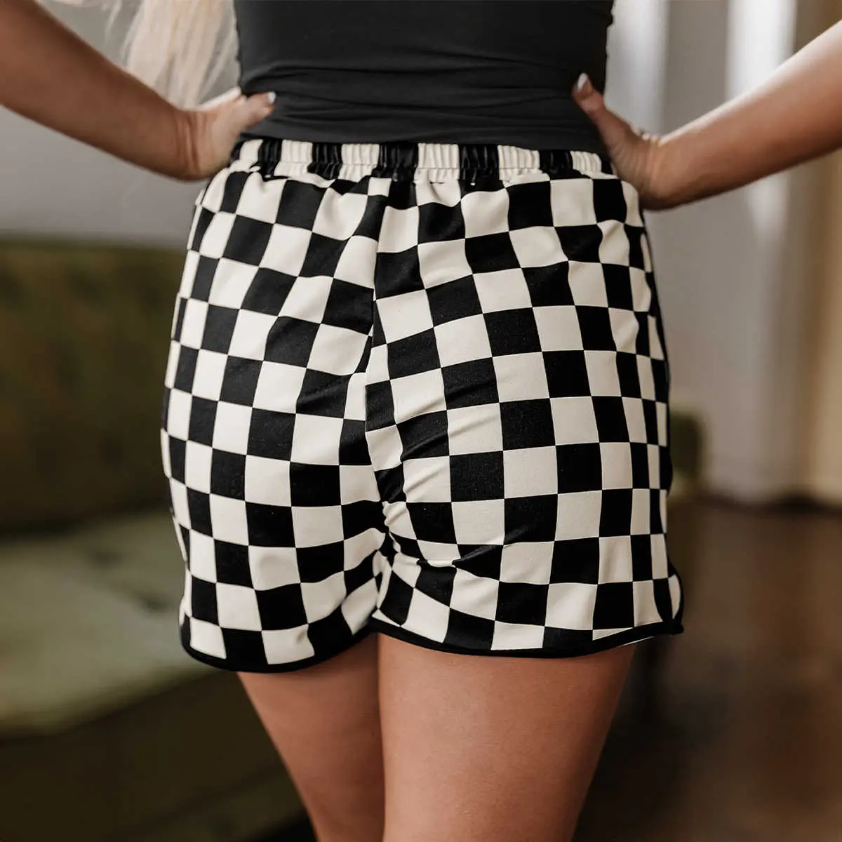 Black Checkered Drawstring Elastic Waist Casual Shorts