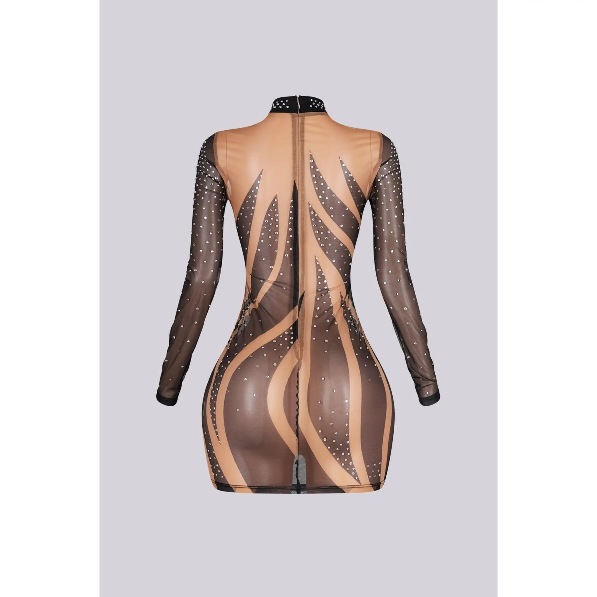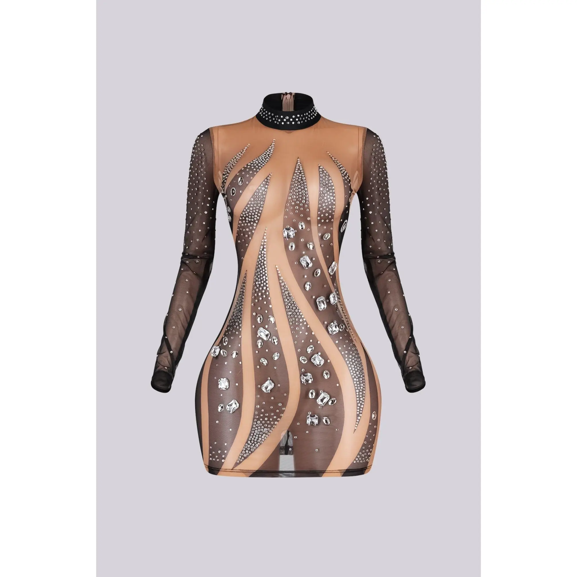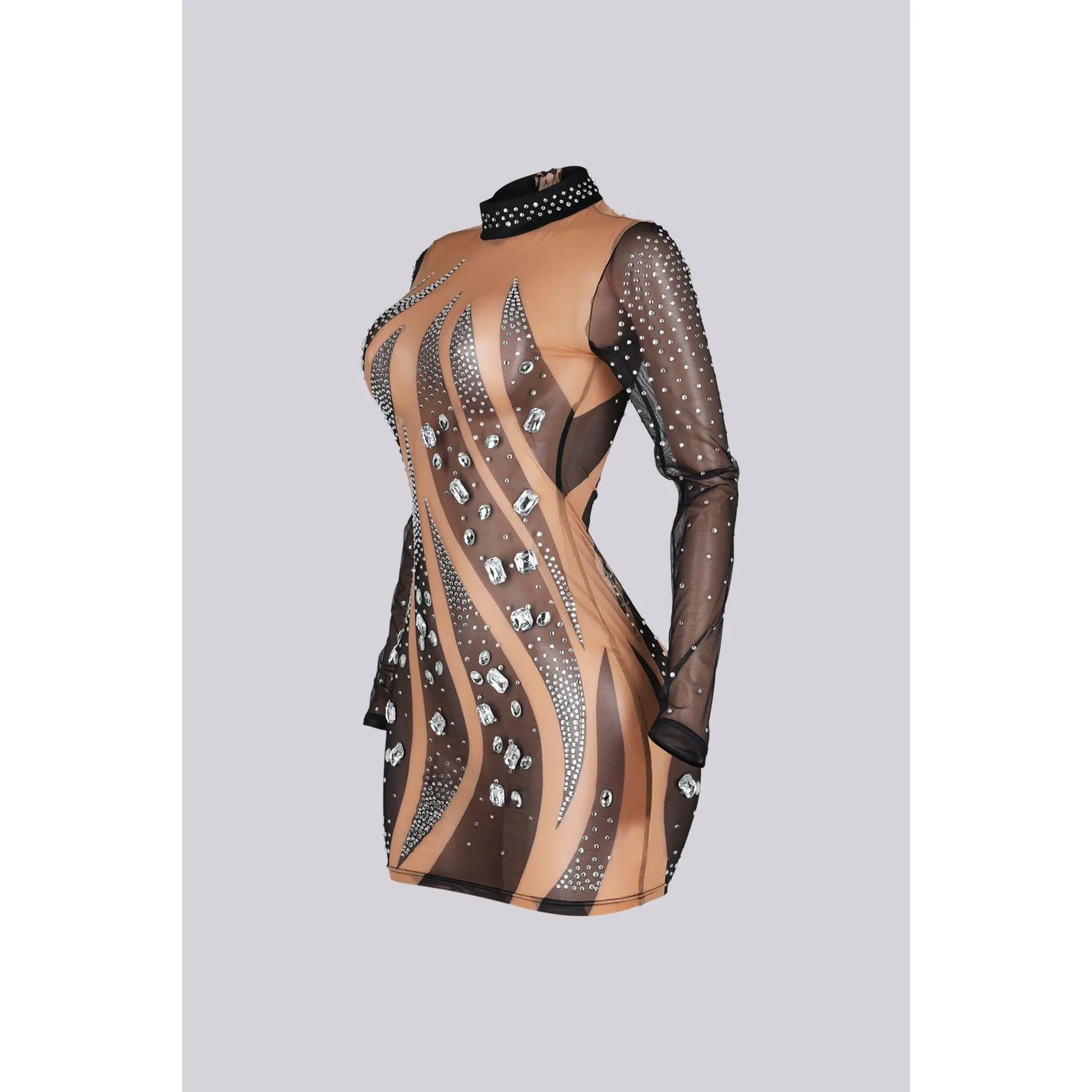 Long sleeve mesh mini dress featuring a standing collar and rhinestone embellishments