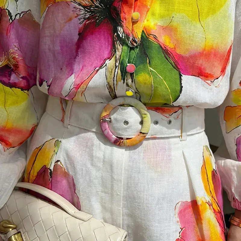 ·Design Details: The button-front top is elevated by elegant lantern sleeves and elastic cuffs. Coordinated watercolor floral prints bring the look together, while the lined shorts include functional pockets for added practicality.