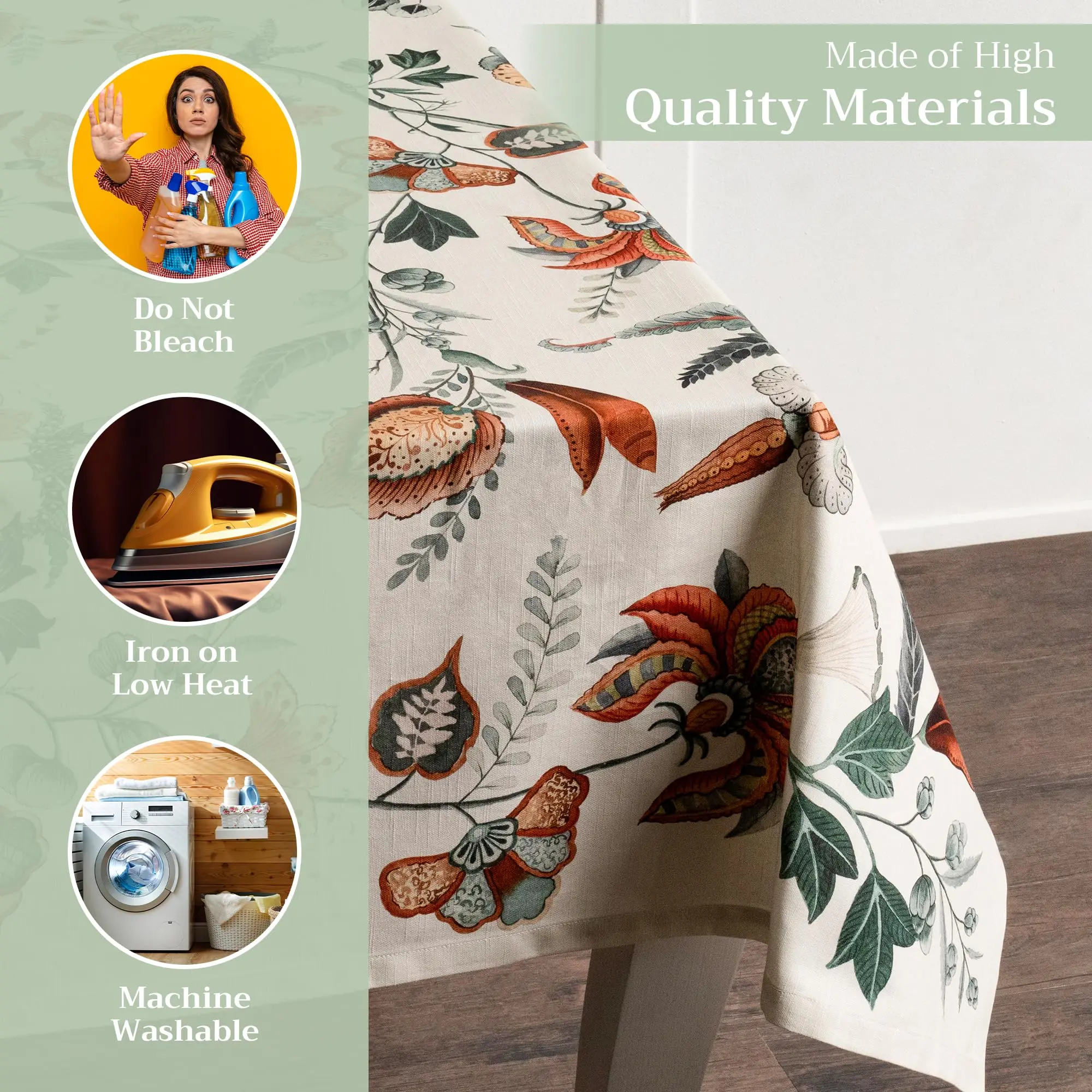Easy to care for: This durable cotton table cloth is machine washable, tumble dry low, do not bleach and warm iron if needed. It retains its vibrancy and quality, making it perfect for everyday use or as a reliable Easter tablecloths