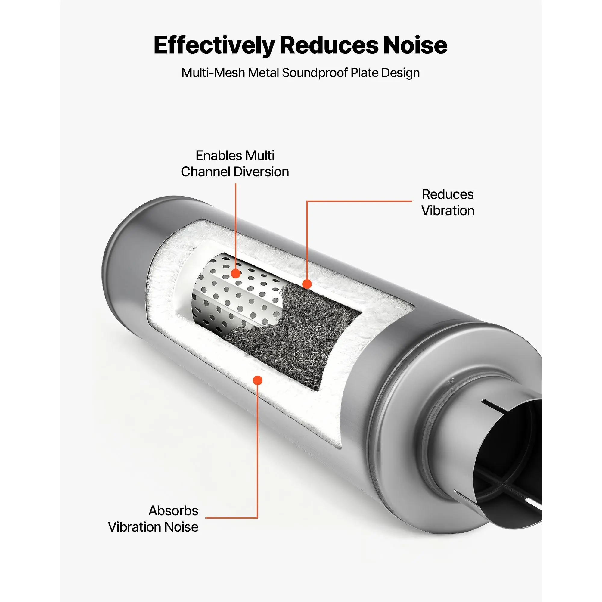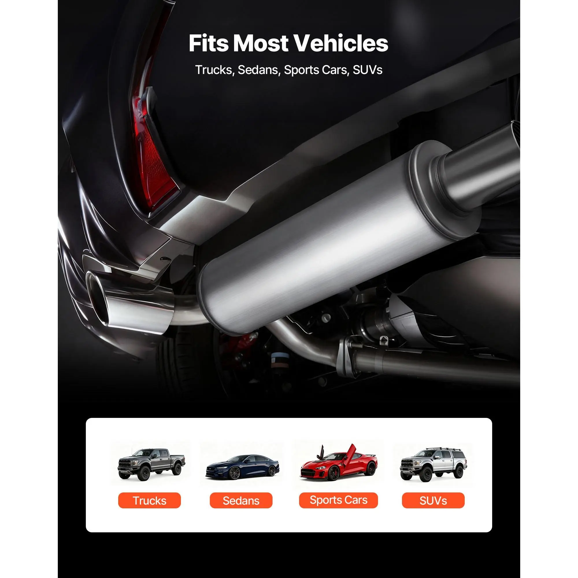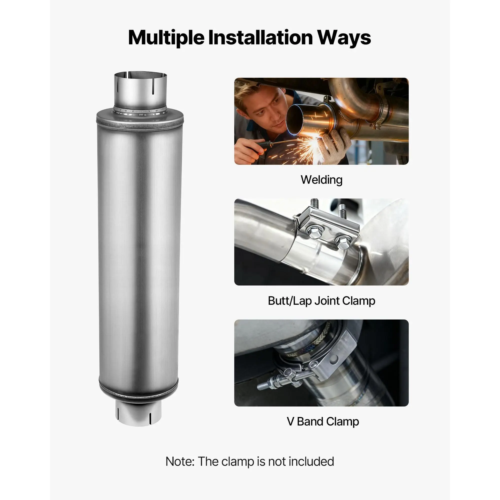 Universal Exhaust Muffler: Designed for 4-inch outer diameter exhaust pipes, this DIY-friendly exhaust muffler fits most systems, making it easy to replace, repair, or customize, supporting creative modifications for various driving needsEffective Noise Reduction: Our stainless steel resonator muffler features a multi-mesh metal soundproof plate with Helmholtz resonance to reduce specific exhaust frequencies, lowering noise for quiet driving, and minimizing low-frequency vibrationsOptimized Exhaust Flow: Our stainless steel resonator adopts a streamlined internal design to reduce backpressure for efficient exhaust.It supports engine performance, enhancing power output-ideal for high-performance vehicles and custom exhaust setupsDurable & Stable: Made from premium stainless steel, this universal resonator resists high-temperature exhaust corrosion and rust, ensuring long-lasting performance and reliable operationEasy to Install: The resonator muffler supports clamp or weld installation, allowing DIY or professional setup.Quick and simple to install, it ensures maximum stability once mountedVEVOR Exhaust Muffler, 4 Inch Inlet & Outlet, 30 Inch Overall Length Stainless Steel Exhaust Tip, Universal Resonator Round Body, High Performance for Trucks, Sedans, Sports Cars, SUVs & Daily Drivers
