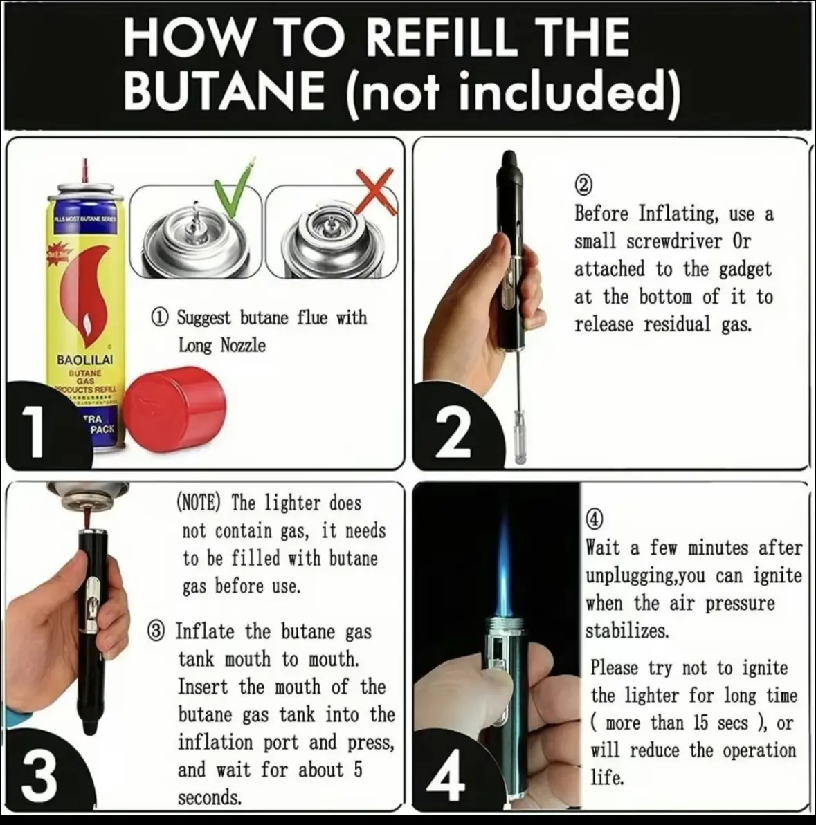 Due to shipping regulations, this product is shipped without gas and requires self-refilling with butane gas.