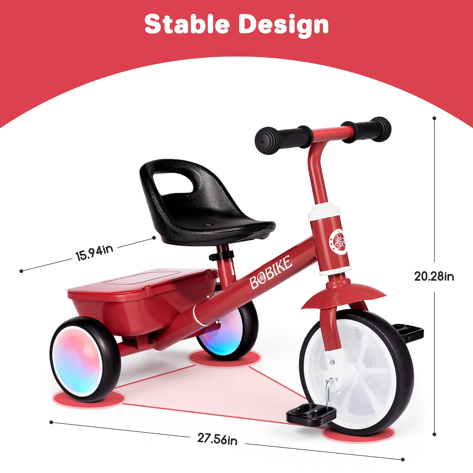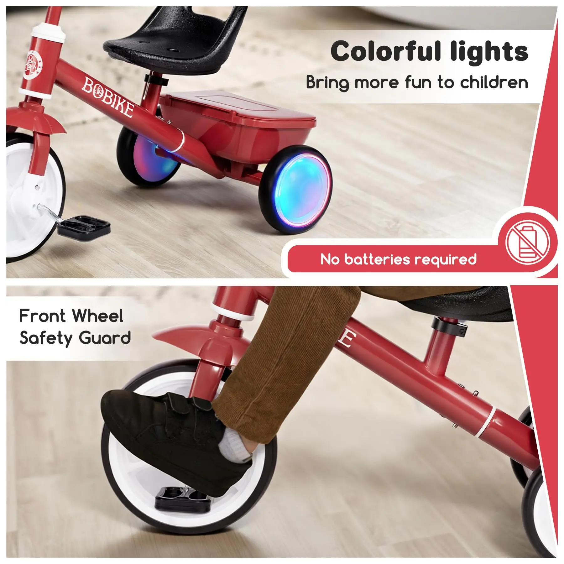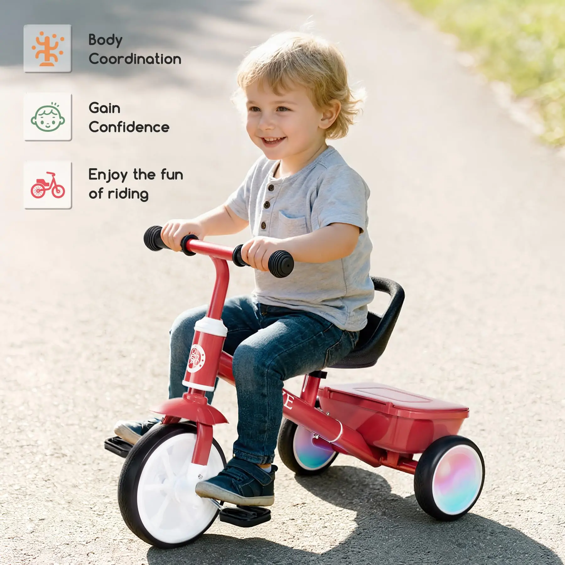 ·Toddler Tricycle with Glowing Wheels & Rear Storage: Watch your child's eyes light up with our innovative LED glow wheels that sparkle with every movement, no batteries required! This versatile toddler bike features rear storage basket perfect for carrying favorite toys and outdoor discoveries.
