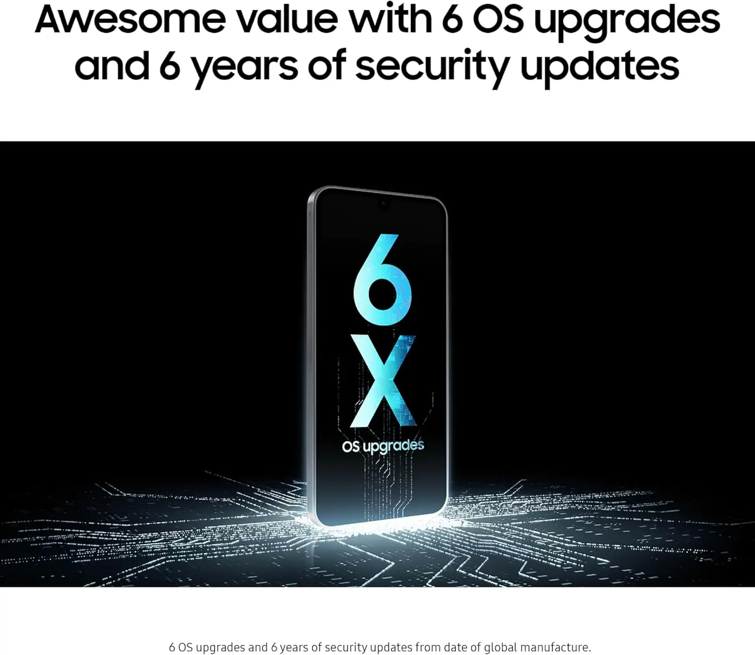 ·6 OS AND 6 YEARS OF AWESOME SECURITY UPDATES: Get more value from a phone that’s designed to go the distance inside and out. Galaxy A17 5G brings you 6 OS and 6 years of security updates, keeping your phone protected, efficient and up to date for longer.⁵