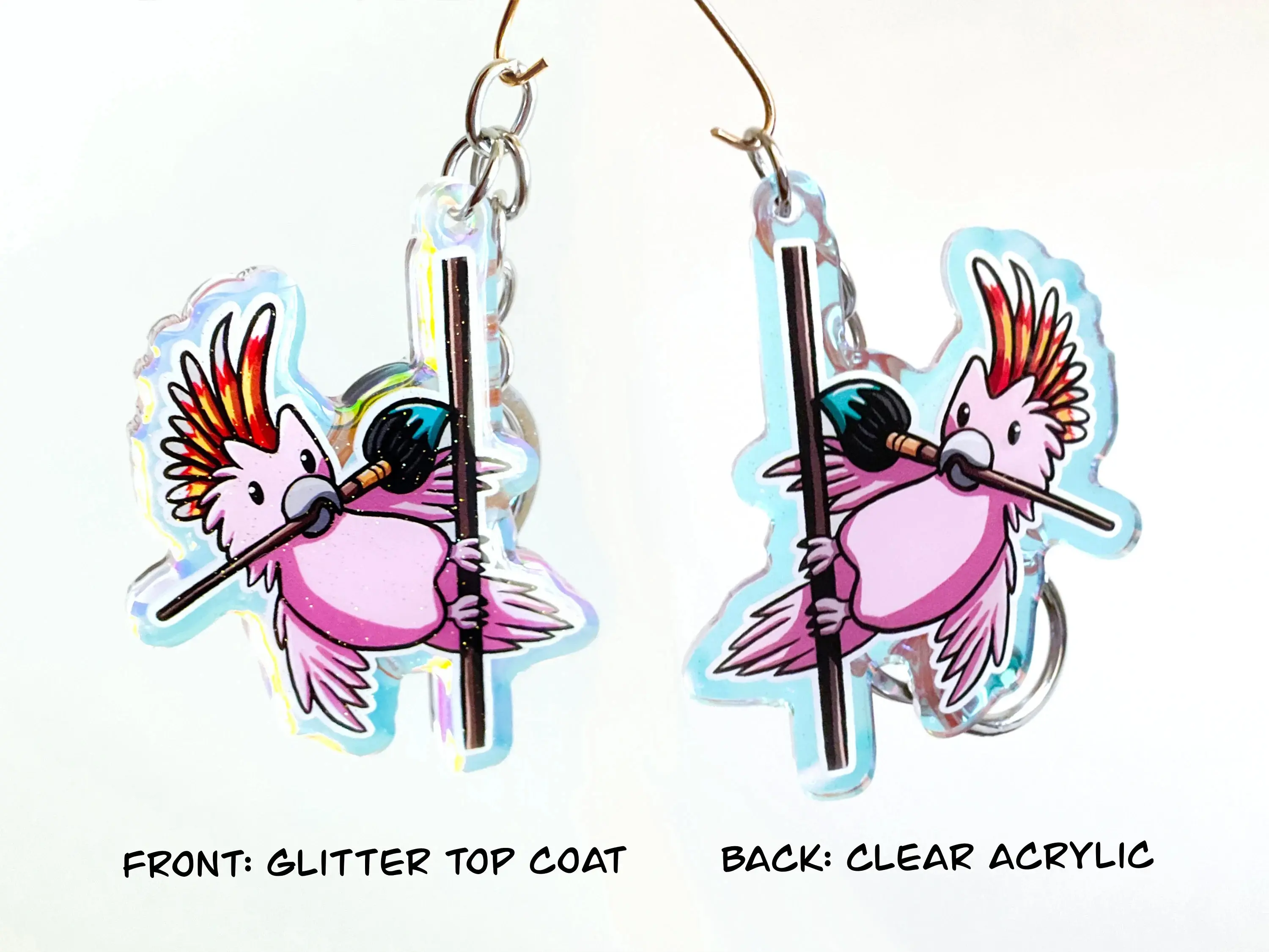 This adorable cockatoo loves to create art! She makes a great gift for readers of all ages! The charm on this acrylic keychain is 2.5 inches in height and features a sparkly top coat on the front side. Design is visible on both sides of the charm.