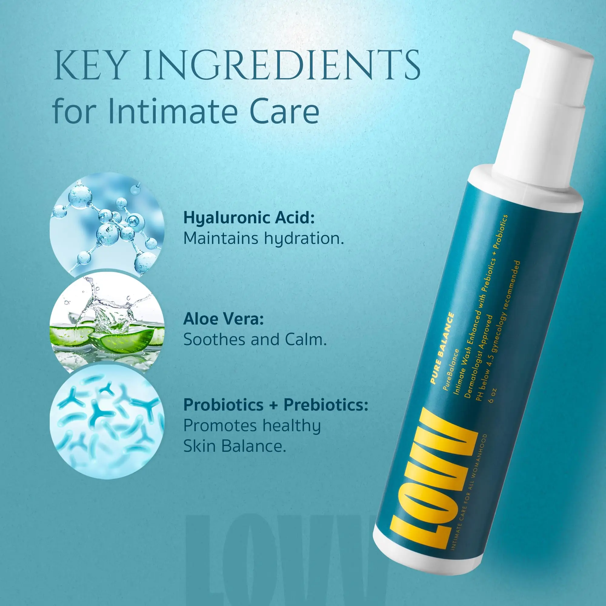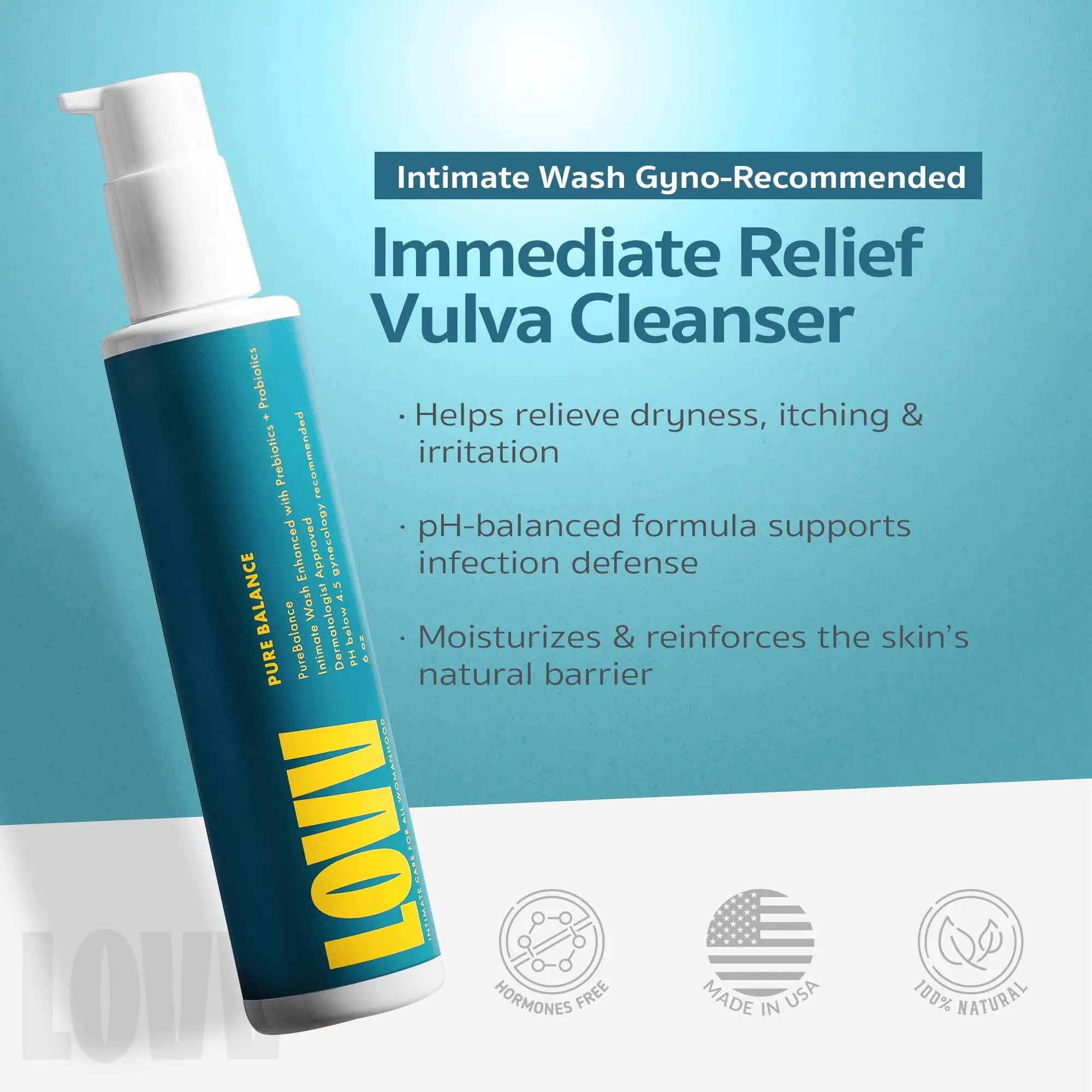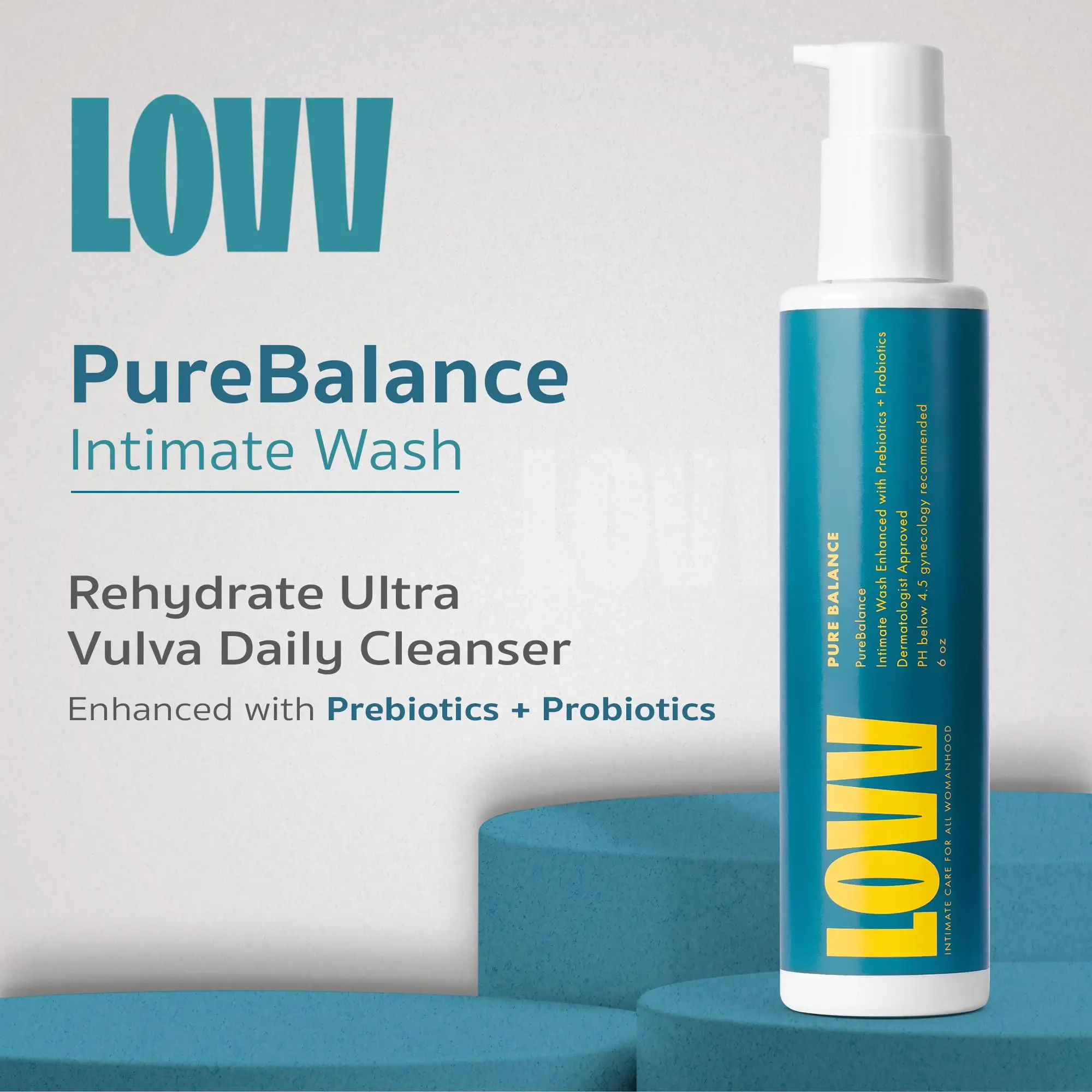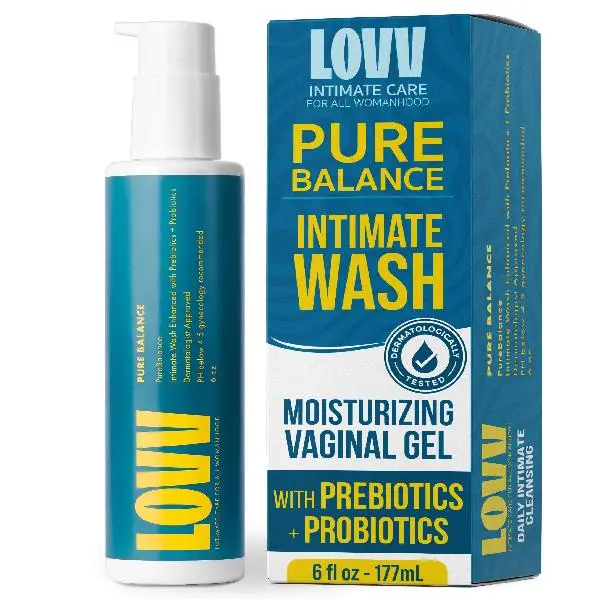 "Experience calm and confident cleansing with LOVV PureBalance Intimate Wash a gentle feminine care essential designed to support the delicate balance of intimate skin. Formulated at a pH of 4.5 this gynecology recommended cleanser helps maintain natural pH levels while effectively cleansing without irritation. This daily vaginal wash combines hyaluronic acid probiotics and prebiotics to deliver hydration freshness and comfort while supporting natural flora. Panthenol rice extract and yogurt extract soothe dryness calm sensitivity and help protect the skin barrier leaving you clean soft and refreshed. Infused with lactic acid the wash offers mild exfoliation that encourages healthy skin renewal without harsh abrasives. Despite its advanced performance the cleanser remains lightweight and gentle enough for sensitive skin making it ideal for everyday feminine hygiene or as a refreshing companion to feminine wipes when on the go. Created with clean beauty standards PureBalance is free from fragrance essential oils parabens sulfates and mineral oil for safe non irritating use. To use simply apply a small amount with warm water lather gently on external areas rinse thoroughly and pat dry. Its soothing formula is as gentle as a face wash yet tailored for intimate care. Follow with LOVV’s moisturizer or serum for enhanced hydration and balance. For external use only. Not recommended during pregnancy. Discontinue if irritation occurs. Transform your intimate care routine with a feminine wash that hydrates restores balance and refreshes sensitive skin every day."