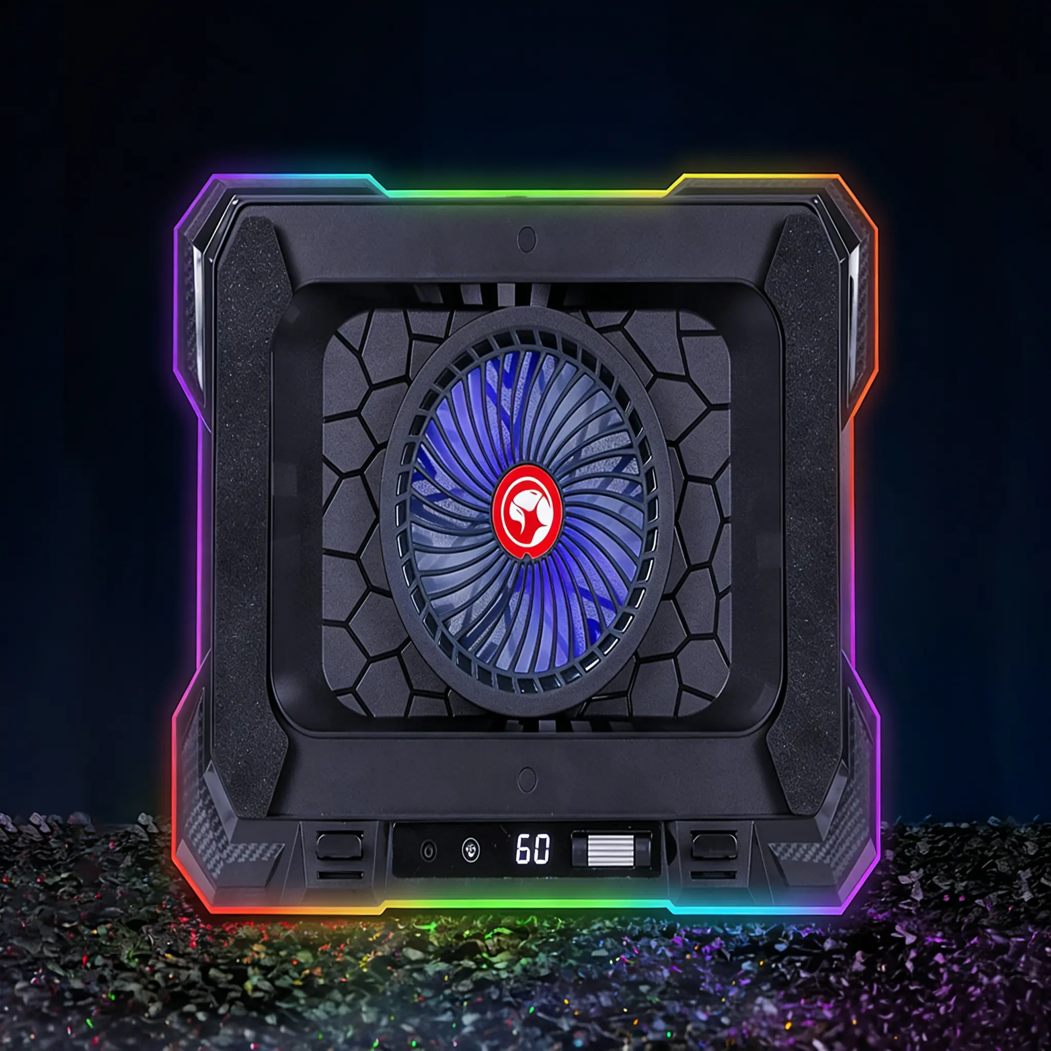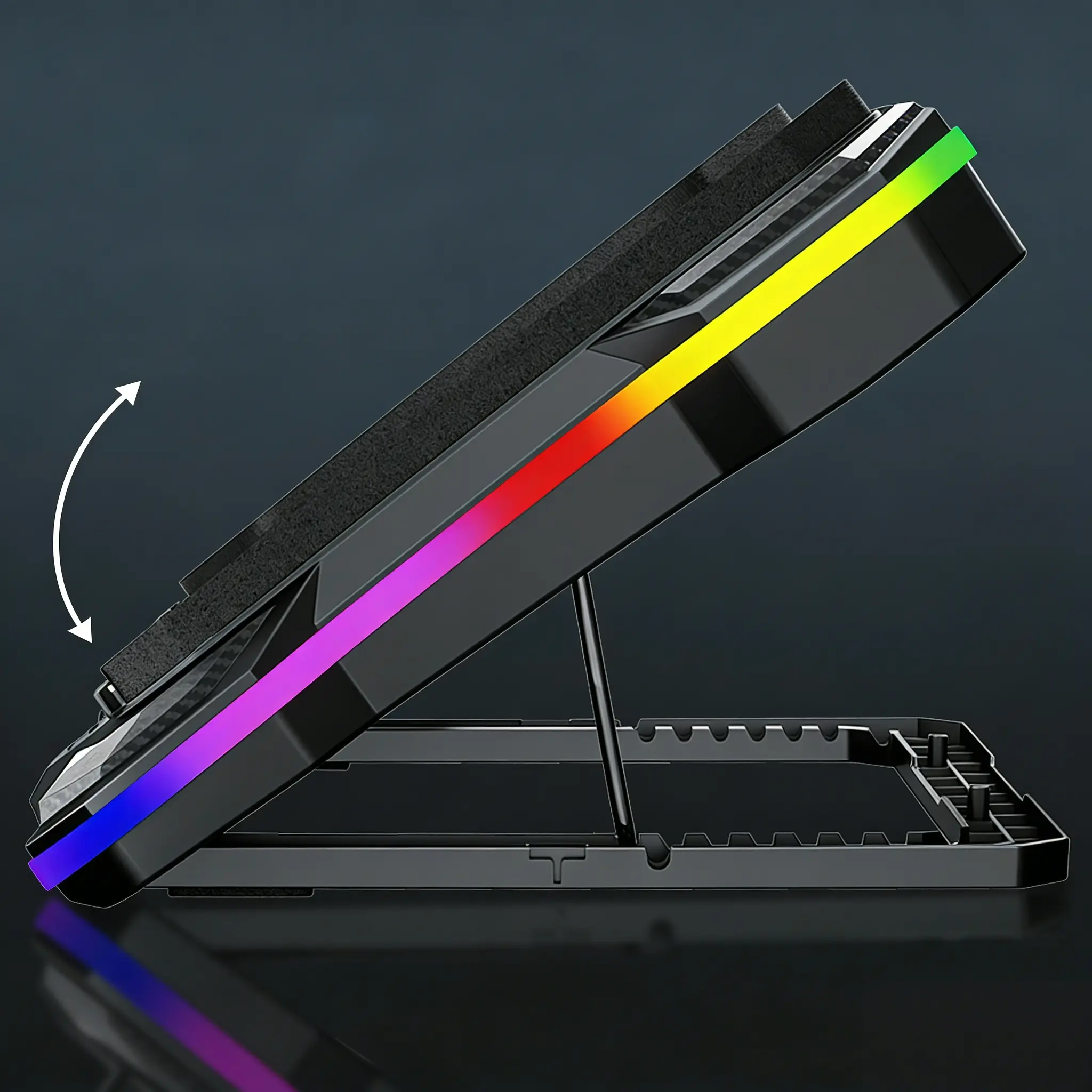 Elevate your laptop's performance with this Cooling Stand. It features a 140mm fan delivering 300-2200 RPM. Adjust the speed to suit your needs. The stand offers 7-level angle adjustment for optimal comfort. RGB lighting adds a stylish touch. 🌟