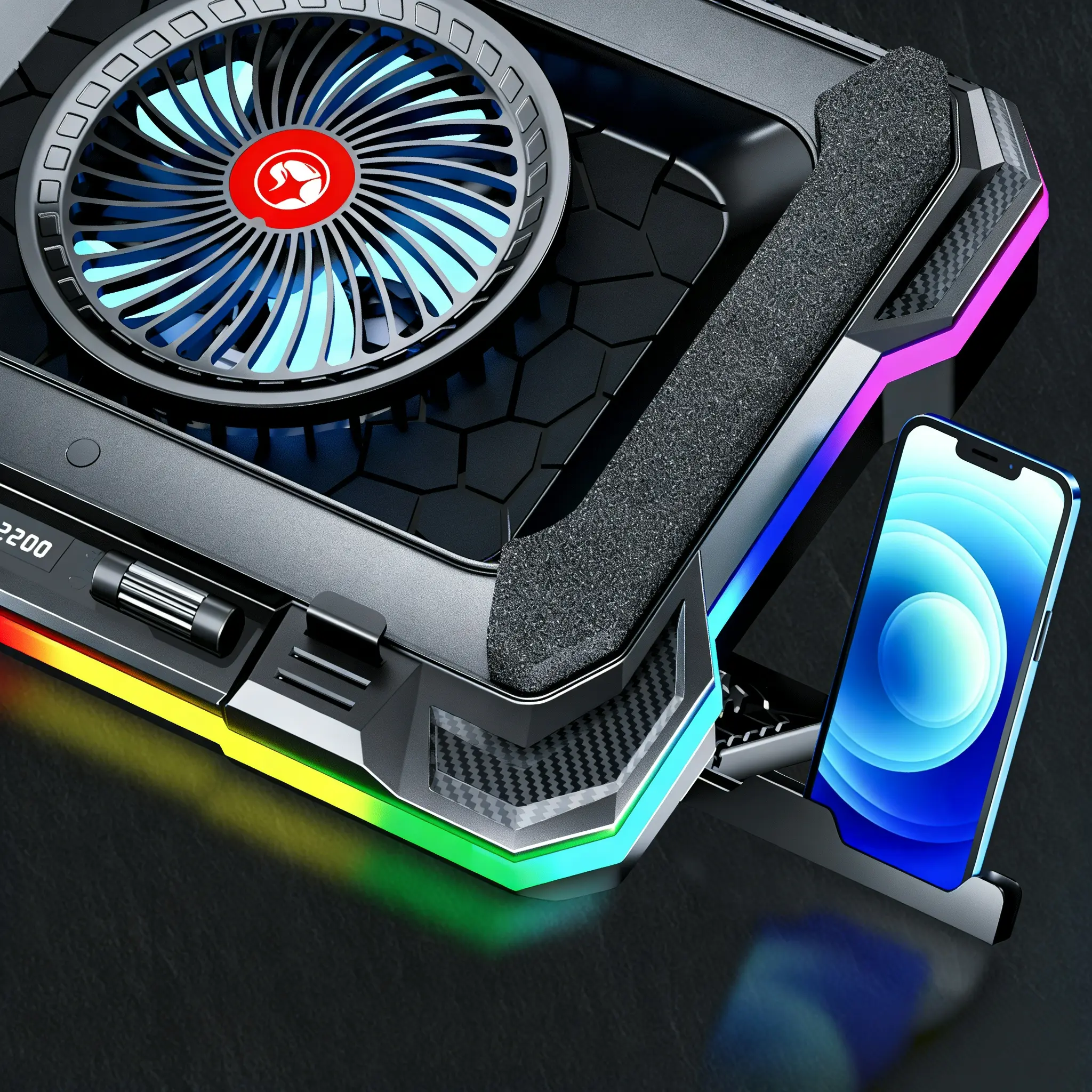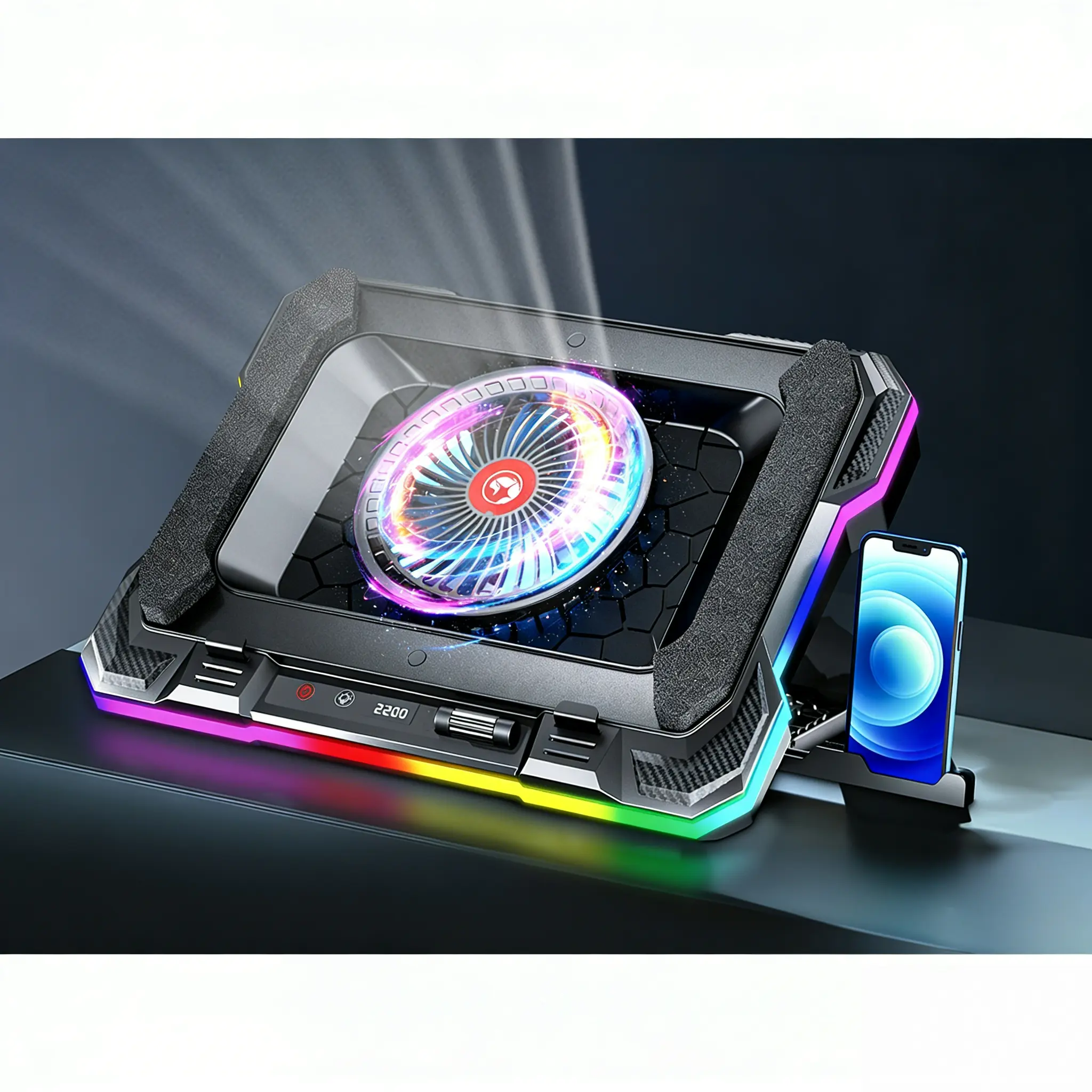 Laptop Cooling Stand with 140mm Fan 300-2200 RPM Adjustable Speed 7-Level Angle Adjustment RGB Lighting Dual USB Ports Phone Holder for 14-19 Inch Laptops Ideal for Gaming Office Campus Use