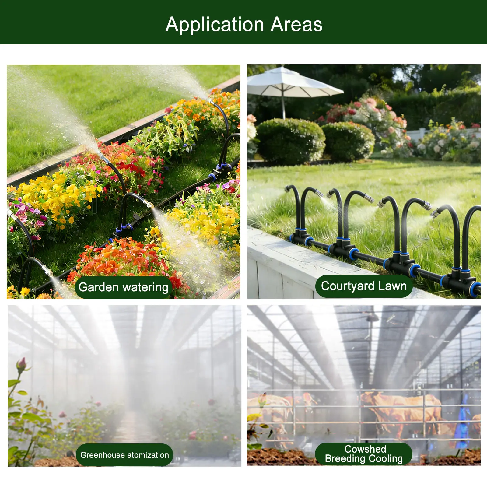 The system is easy to install and can be set up quickly. It adopts a pneumatic three-way quick-connect structure with ground stakes for fixation, plug-and-play and easy to disassemble. Complete full set of accessories are included, no extra purchase needed. You can DIY the hose length freely.