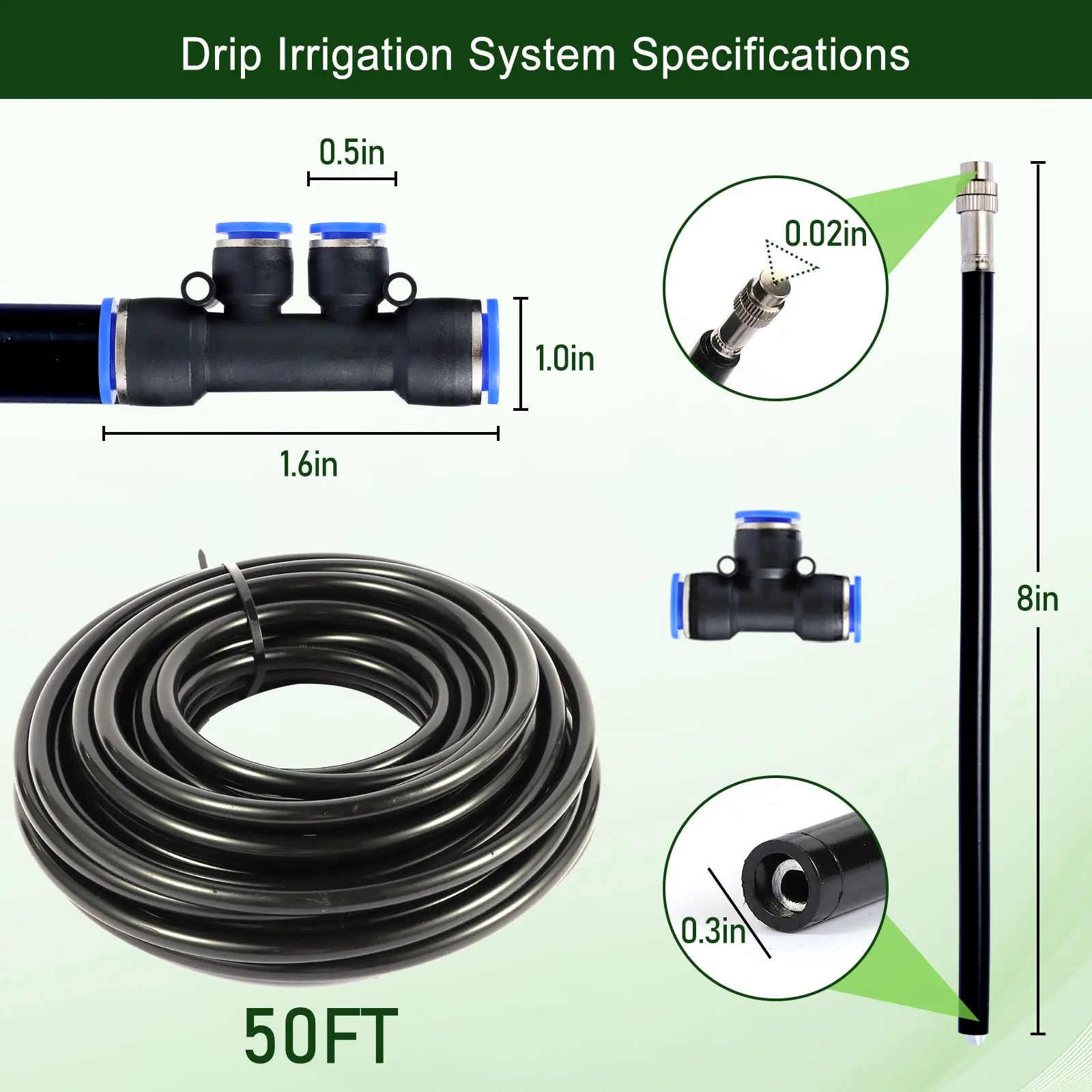 This drip irrigation system is designed with an enlarged inner diameter and extended nozzle. The enlarged inner diameter improves water flow and stability, helping reduce water shortage and uneven flow. The extended nozzle better meets the watering needs of small and medium-sized trees.