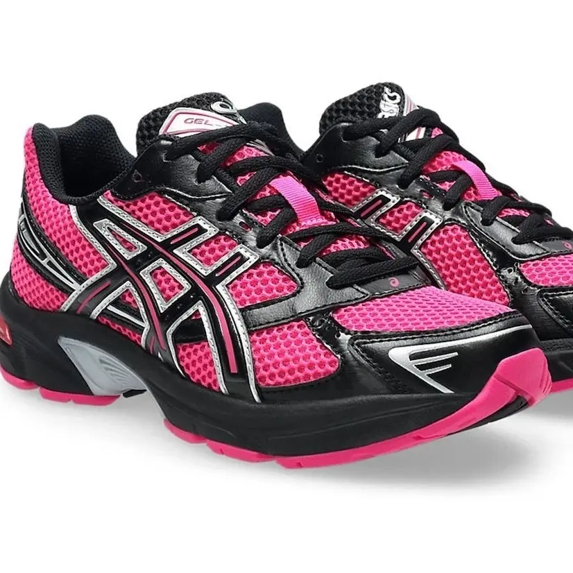 The ASICS Gel 1130 'Pink Glo' dresses the lifestyle runner in an eye-catching palette, highlighted by a breathable hot pink mesh upper with contrasting leather overlays in black and metallic silver. Lightweight cushioning is provided by a full-length EVA midsole, painted black and fitted with a pink-tinged Gel insert in the heel. Underfoot, the rubber outsole reveals an exposed TPU shank plate, dubbed the TRUSSTIC support system.
