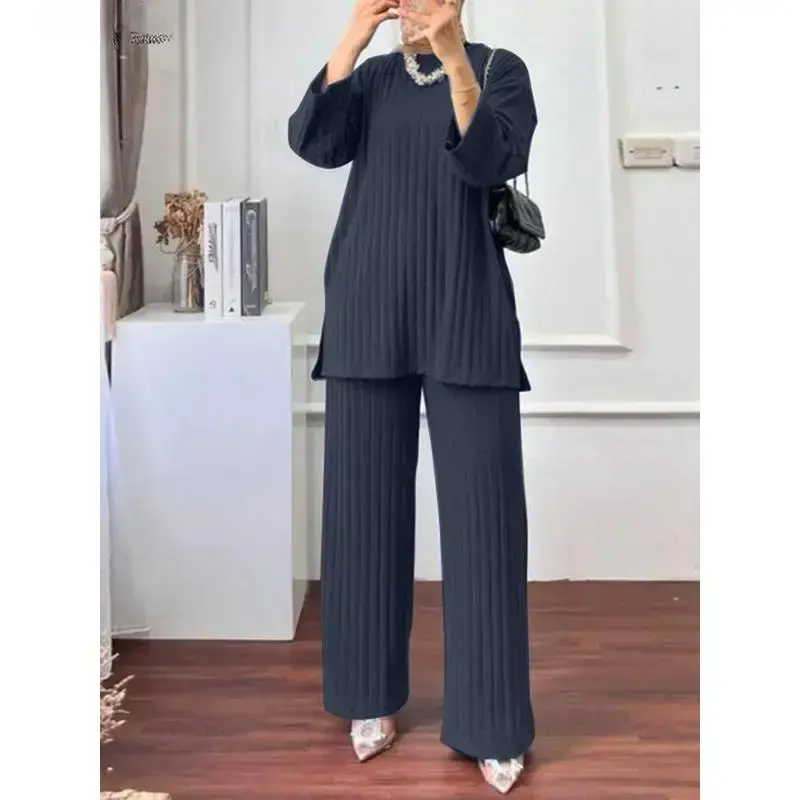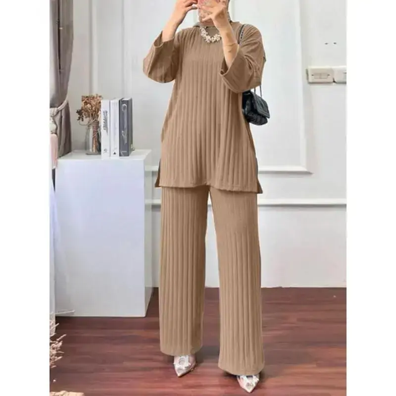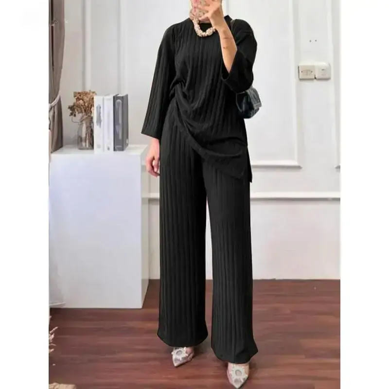 Relaxed Understated Long Sleeve Blouse Wide Leg Pants Sets Women Matching Sets Solid Islamic Clothing Muslim Tracksuit Outifits 2PCS
