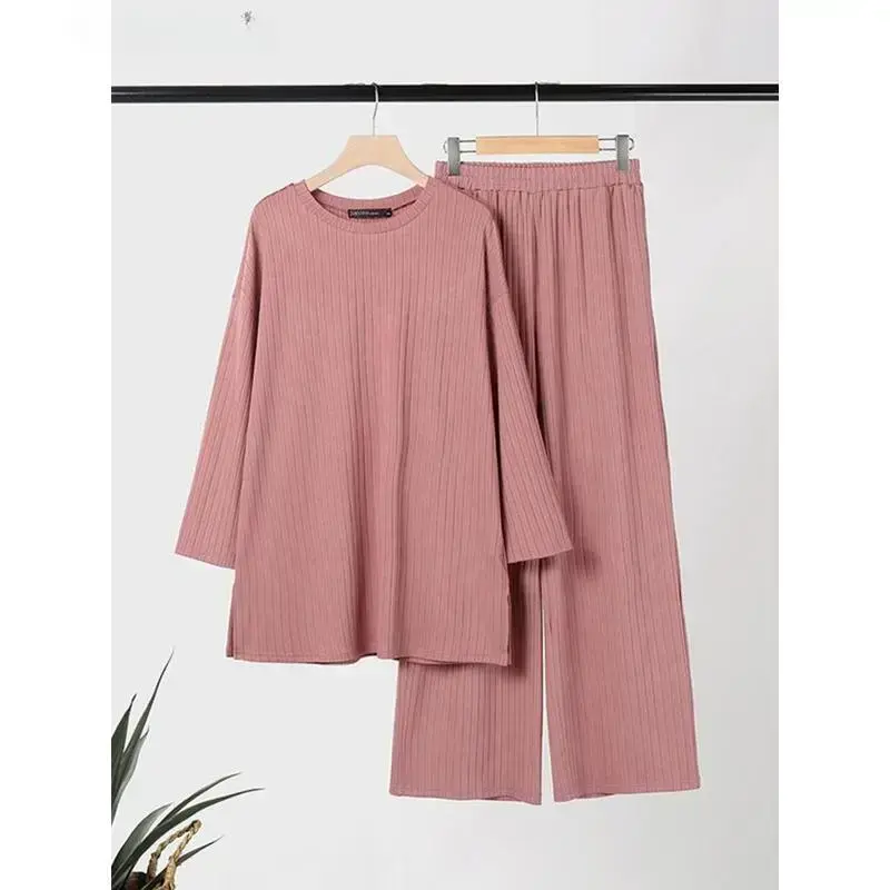 Relaxed Understated Long Sleeve Blouse Wide Leg Pants Sets Women Matching Sets Solid Islamic Clothing Muslim Tracksuit Outifits 2PCSGift