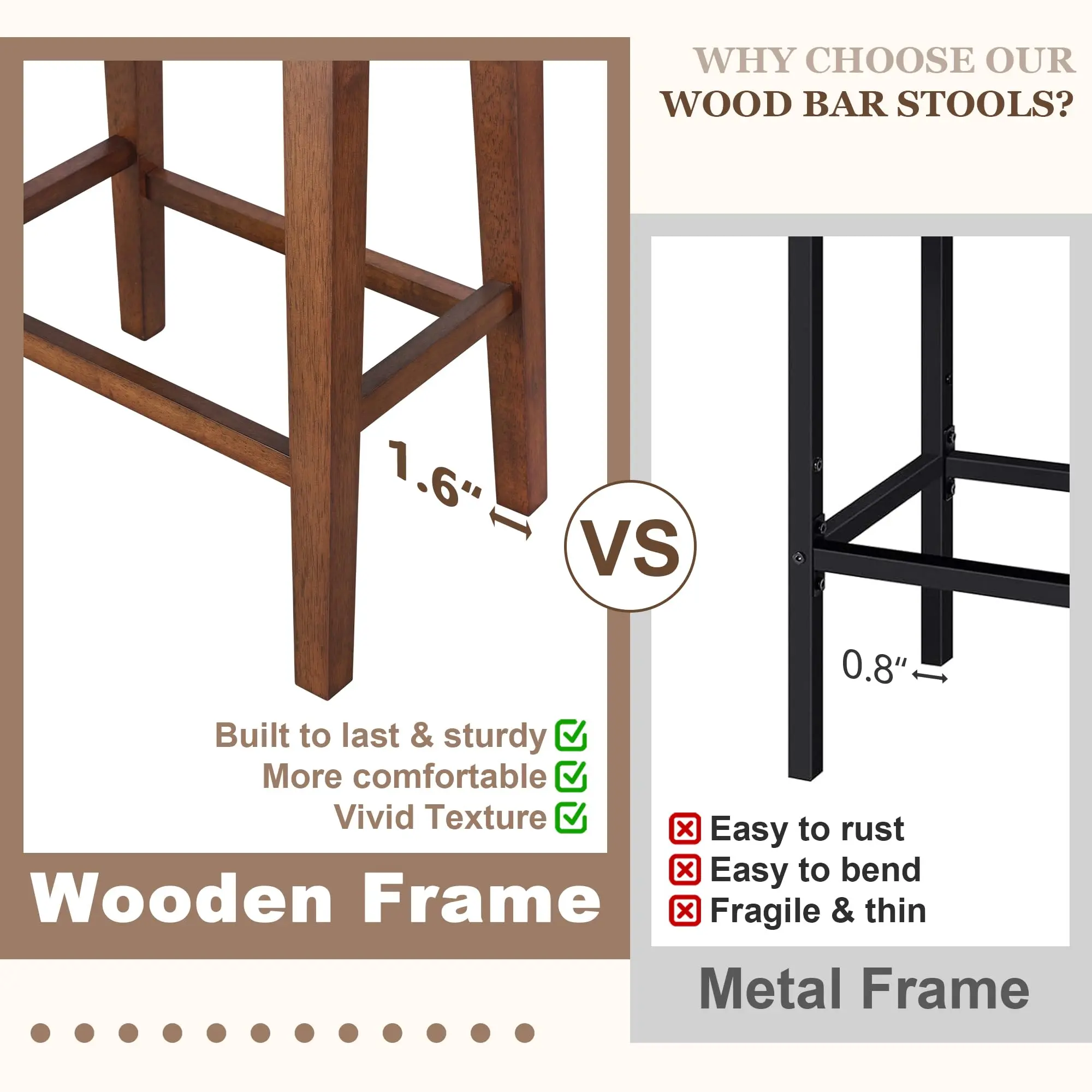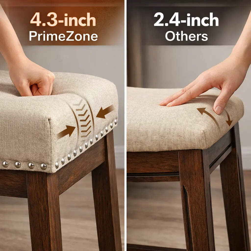 Designed with a 4.3-inch thick padded cushion, these saddle seat bar stools naturally contour to your body. The ergonomic curved seat reduces pressure on your hips and helps prevent fatigue — perfect for long chats over coffee or family dinners at the kitchen island.