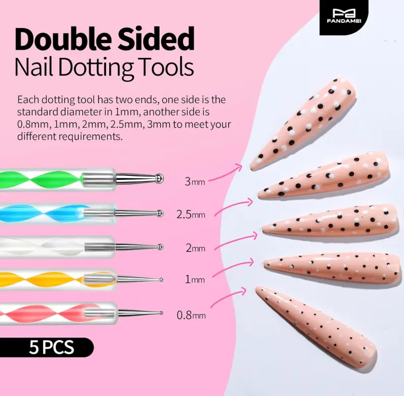 ·Double-sided Nail Dotting Tool: Made of metal alloy and acrylic. With 5 varied sizes of tip to meet different nail design needs. Each dotting pen has two ends, one side is the standard diameter in 1mm, another side is 0.8mm, 1mm, 2mm, 2.5mm,3mm to meet your different requirements. The dotting tools nail art are used to create dots of uniform or gradual size, or to pill dots into petal shapes for fine detail.