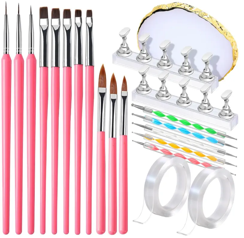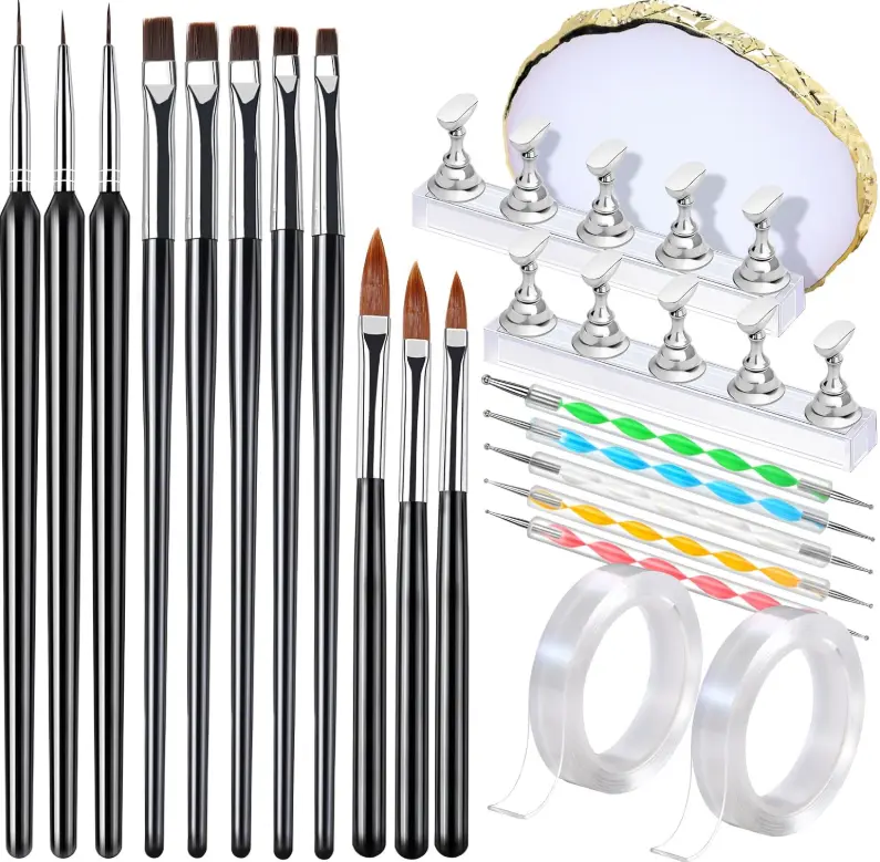·Frequently Used Nail Brush Set With Nail Stand: What you will get: 5 x flat head nail art brushes; 3 x drawing nail art brushes; 3 x liner brushes for nails; 5 x nail dotting tool; 2 set of magnetic nail stand (including 10 PCS chess-shaped nail stand for press ons, 2 PCS rectangular clear base), 2 x double-sided tape for nail holder; 1 x nail art palette. Practical acrylic nail supplies and nail design tools for beginners or professional help to create nail design work!