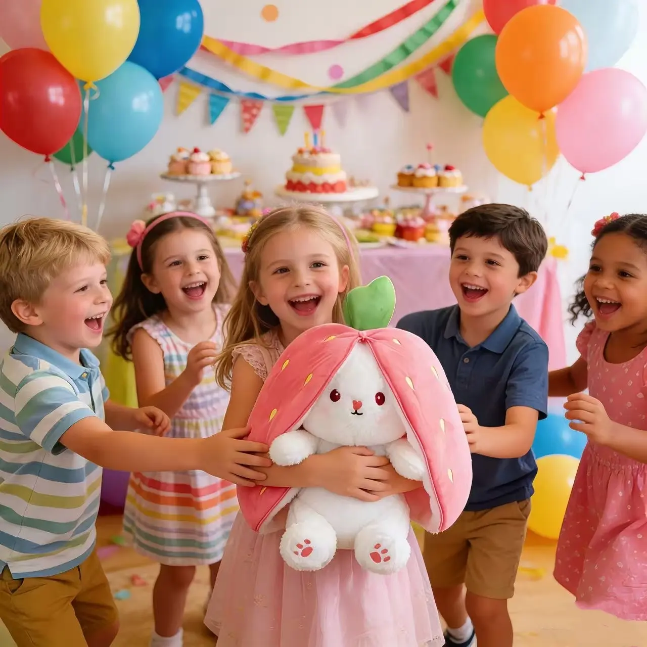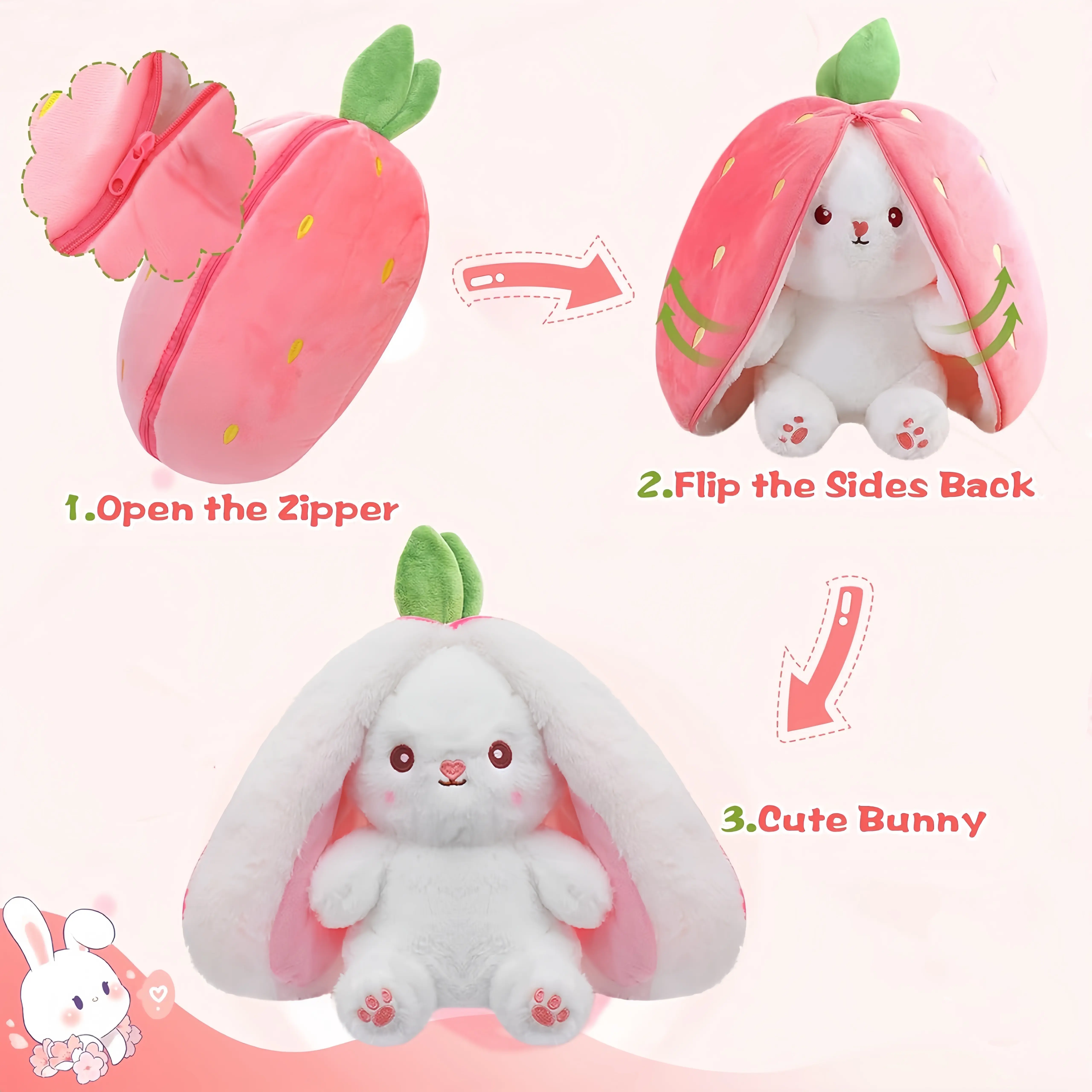 【High-Quality Material】Changeable Bunny Plush: It's easy to go from a strawberry to a white rabbit. Bunny stuffed animal, fine workmanship, adorable, soft baby stuffed animal is made with smooth, soft fabrics and filled with recycled squishy stuffing. The size of this stuffed animal fits perfectly for babies easy to take cute stuffed animal anywhere, and will definitely bring a smile to their face