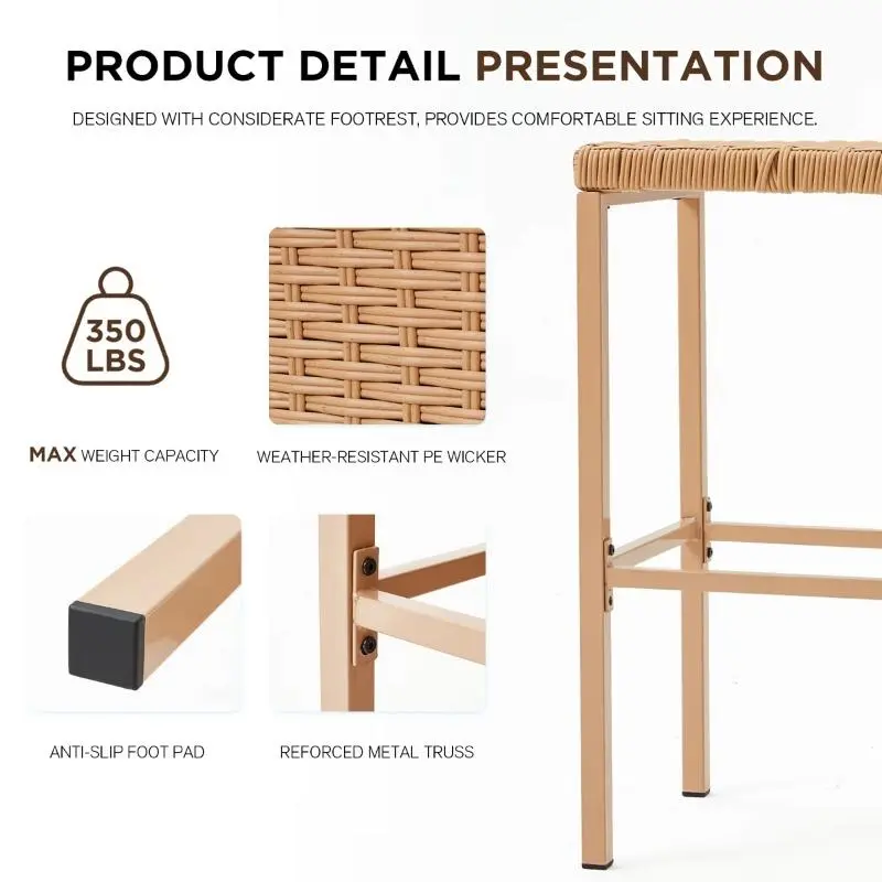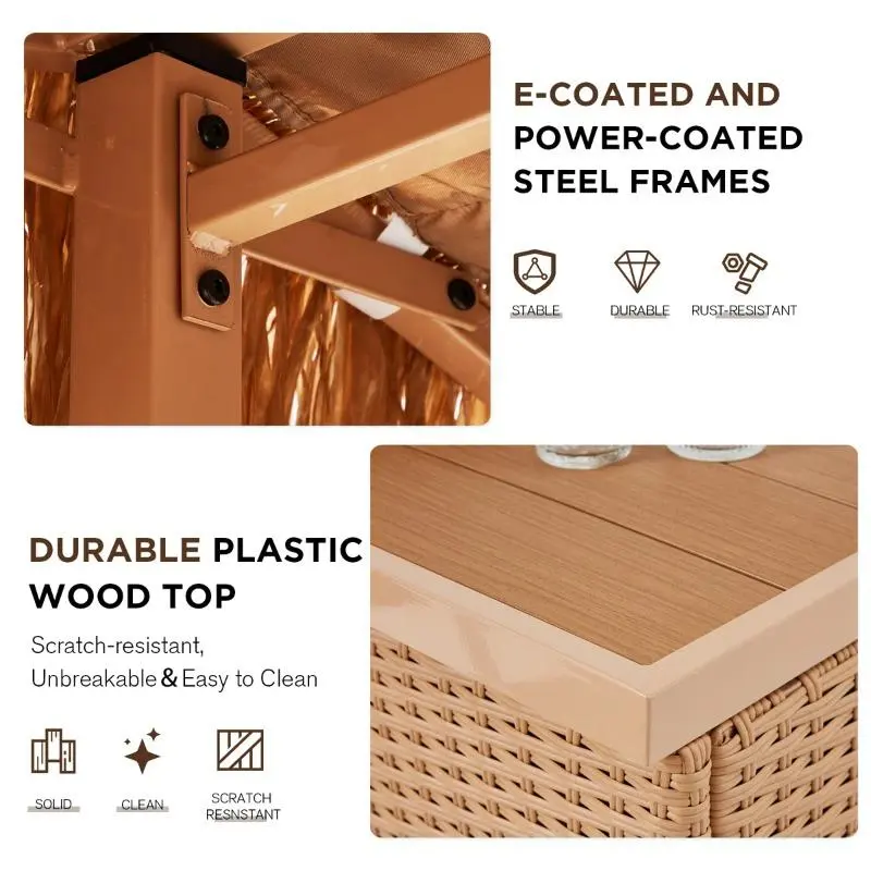 Constructed with UV-resistant resin wicker tested for up to 1500 hours of sun exposure, this patio bar set maintains its vibrant appearance without fading. The powder-coated steel frame resists rust and withstands humid conditions for long-lasting outdoor performance.