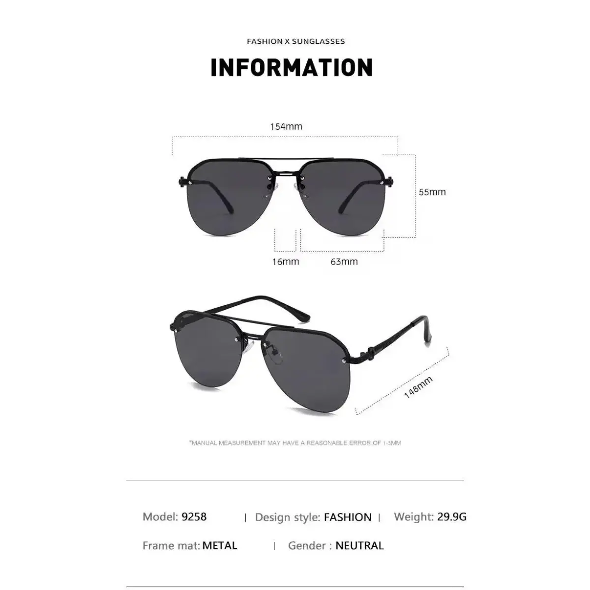 • Stainless Steel Frame : Crafted from durable stainless steel, these sunglasses offer a semi-rimless style that is both fashionable and robust. • UV400 Lenses : Equipped with UV400 lenses, these sunglasses protect your eyes from harmful UV rays, perfect for outdoor use. • Double Beam Design : Featuring a classic double beam design, these sunglasses add a touch of vintage charm to your outfit. • Plastic Lenses : The lenses are made of plastic, ensuring lightweight and flexibility, enhancing your comfort during wear. • Origin : Mainland China • Ideal for Women : Specifically designed for women, these sunglasses are a perfect accessory for any fashion-forward lady. [Specification] [Material]:Plastic [Color]: Grey-pink, gray-yellow,black,brown,gold [Size]: uniform size [Multi purpose]: Running, cycling, climbing, fishing, driving and other outdoor sports [Features] Sunglasses with stylish unisex design fit in well any cloth matching, can be daily wear all year round or as high fashion accessory. It is a perfect choice for enjoying driving, shopping, vacation & all outdoor activities. Super light-weight design can hardly feel them on your face, gives you stress-free wearing experience which ensures you a long time wearing in comfort and style! [Notes] 1.Please protect it properly to avoid crushing. 2.Photos was been shoot based on real prosucts and professional camrea,due to the light and the screen display is different,there will be a certain color,can not be avoided,it is not quality problem. 3.Due to the personal measurement technique is differentThere maybe 1 inch error of the physical,Please choose the size accordingly.