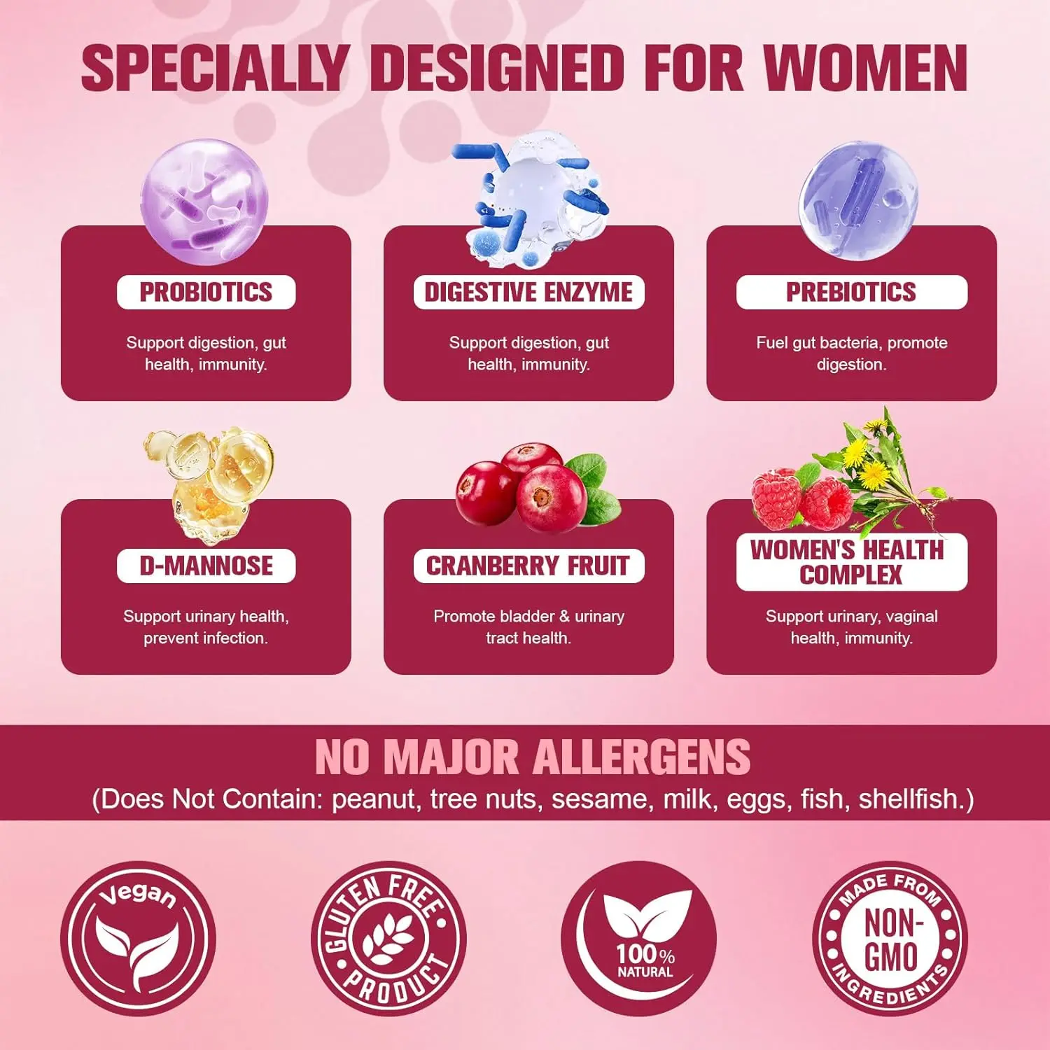 Vaginal & Urinary Support: Features probiotics (L. reuteri, L. rhamnosus) plus Cranberry Extract and D-Mannose to maintain pH balance and promote urinary tract health.