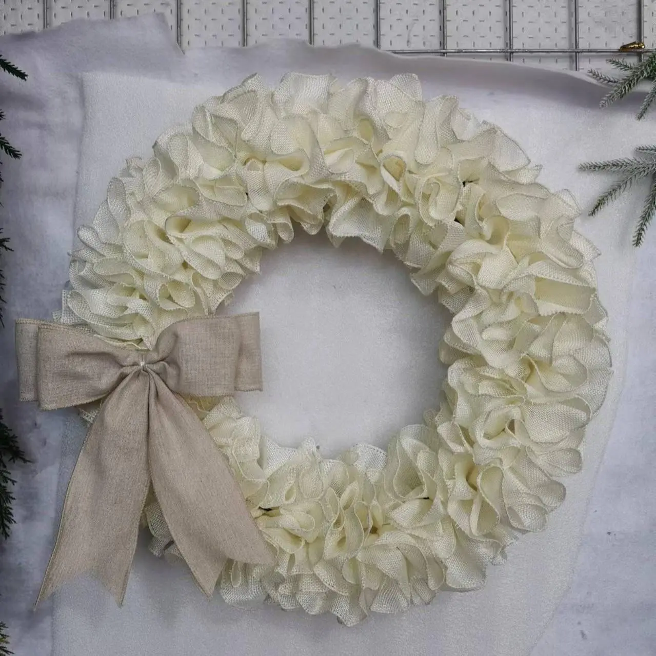 Rustic Linen Wreath with Butterfly Knot, Linen Farmhouse Wreath, Large Bow Wreath, All-Year Rustic Wreath, Mother's Gift, Front Door Wreath