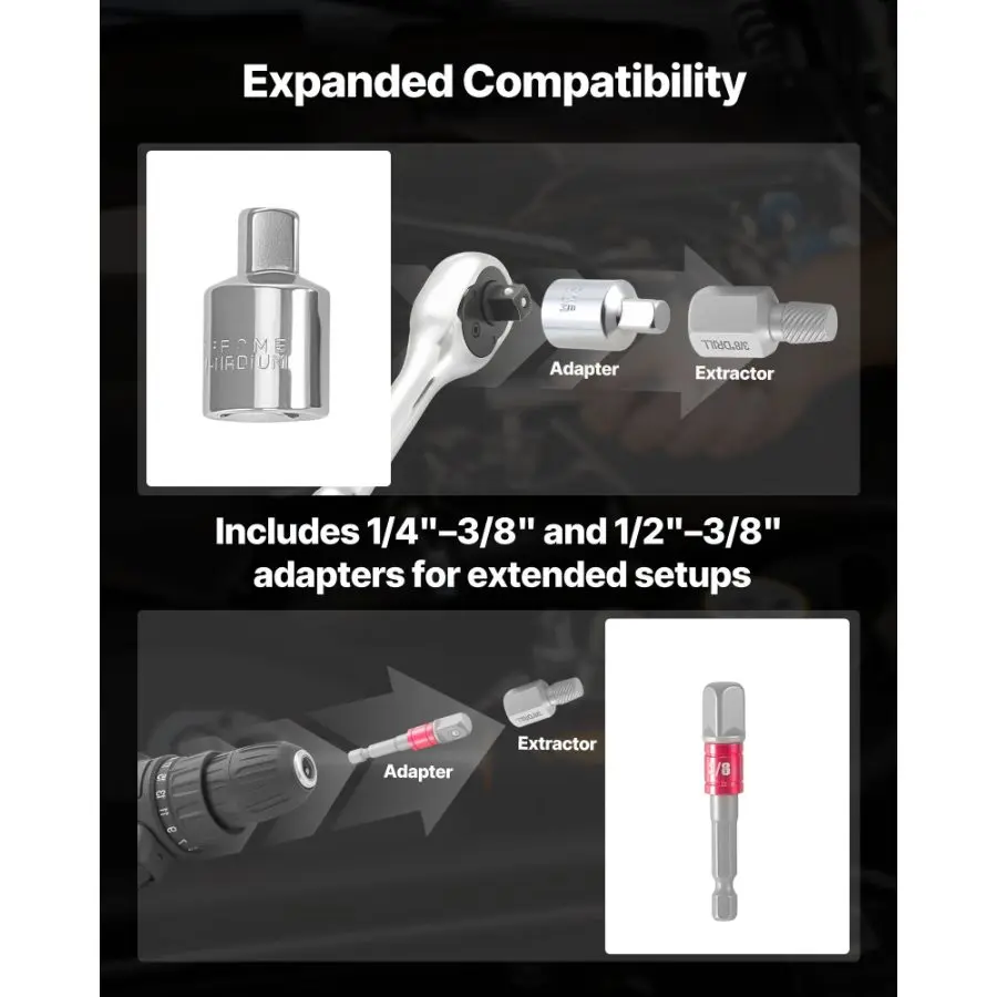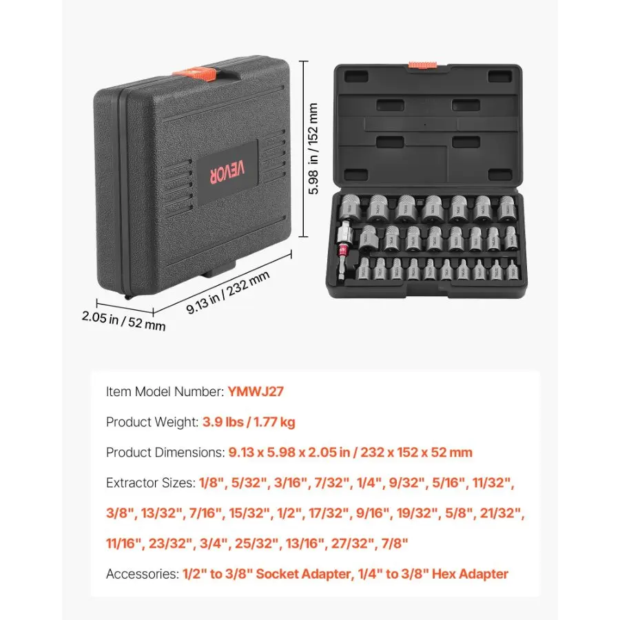 VEVOR Screw Extractor Set, 63 Pieces, with Nut and Bolt Extractors, Nut Splitters, Taps, Drill Bits, Wrenches, Adapters, and Solid Storage Case, for Removing Rounded, Broken, or Stripped FastenersVEVOR Screw Extractor Set, 27 Pieces Hex Head Multi-Spline Easy Out Bolt Extractor Tool, with Adapters, Solid Storage Case, Cr-Mo Steel Stripped Bolt Remover for Removing Rounded, Broken Bolts, Screws