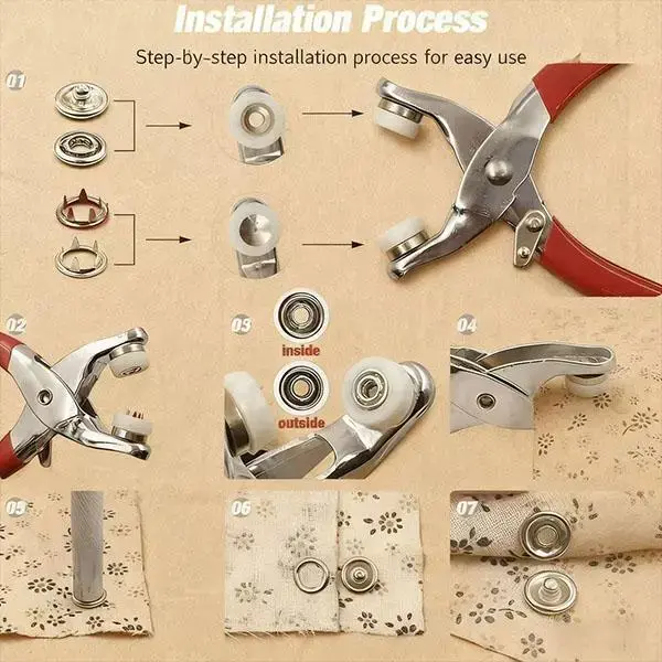 ✨ 100PCS Metal Snap Buttons included in this set. Perfect for DIY clothing, hats, and crafts. This kit comes with a hand press pliers set for seamless fastening. Ideal for anyone looking to enhance their sewing projects.