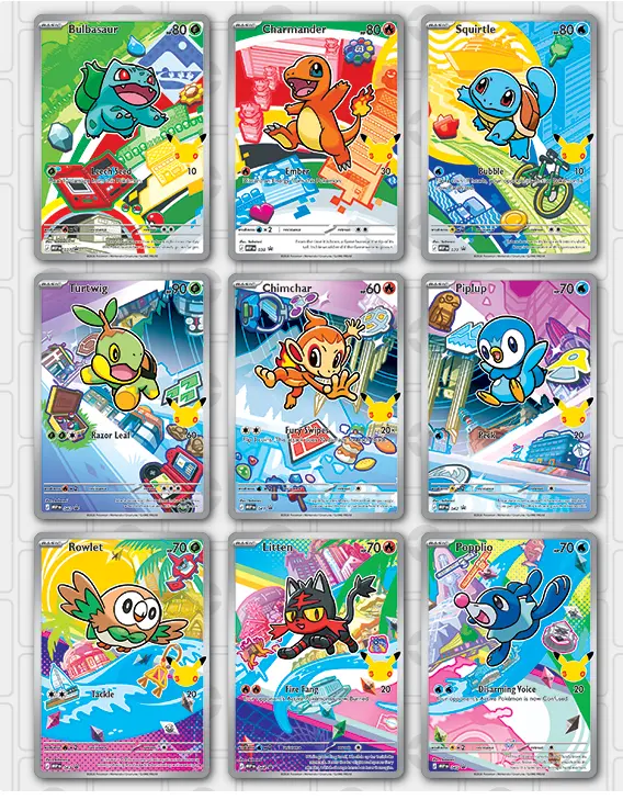 30 Years of First Partner Pokémon! Artwork will be chosen at random Every Pokémon Trainer’s journey begins with a first partner—a loyal friend who stands by your side through thick and thin! Relive your own adventures and celebrate the bond between Trainer and Pokémon with a booster pack containing 3 of 9 illustration rare-style promo cards consisting of beloved first partner Pokémon from the Kanto, Sinnoh, or Alola region. You’ll also find two more Pokémon TCG booster packs and a fun sticker sheet featuring first partner Pokémon friends. The Pokémon TCG: First Partner Illustration Collection—Series 1 includes: • 1 Pokémon TCG booster pack containing 3 of 9 promo cards • 2 Pokémon TCG booster packs • 1 sticker sheet