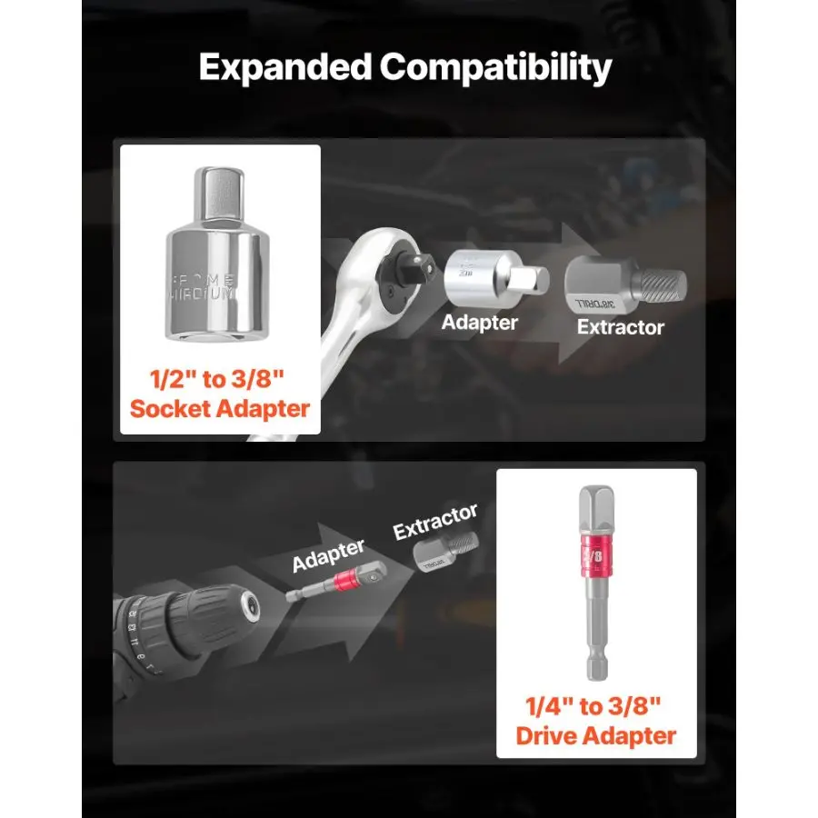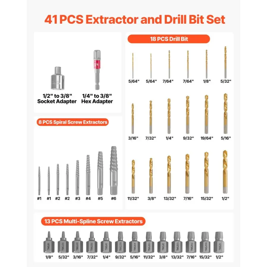 VEVOR Screw Extractor Set, 63 Pieces, with Nut and Bolt Extractors, Nut Splitters, Taps, Drill Bits, Wrenches, Adapters, and Solid Storage Case, for Removing Rounded, Broken, or Stripped FastenersVEVOR Screw Extractor Set with Drill Bits, 41 Pieces, Easy Out Bolt Extractors and Drill Bits, with Adapters, Solid Storage Case, Cr-Mo Steel for Removing Rounded, Broken, or Stripped Bolts, Screws