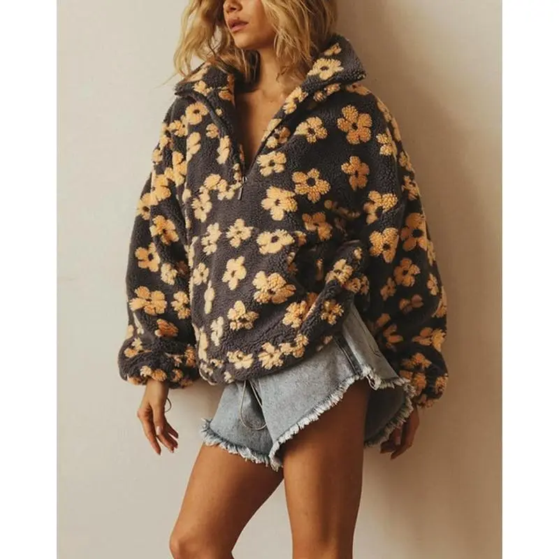 Fleece Half Zip Fall Fleece Sweatshirts Cute Floral Printed Half Zip Pullover Long Sleeve Y2k Sherpa Coat With Pocket Half Zip Fleece Womens Fleece Pullover Sherpa Pullover Womens