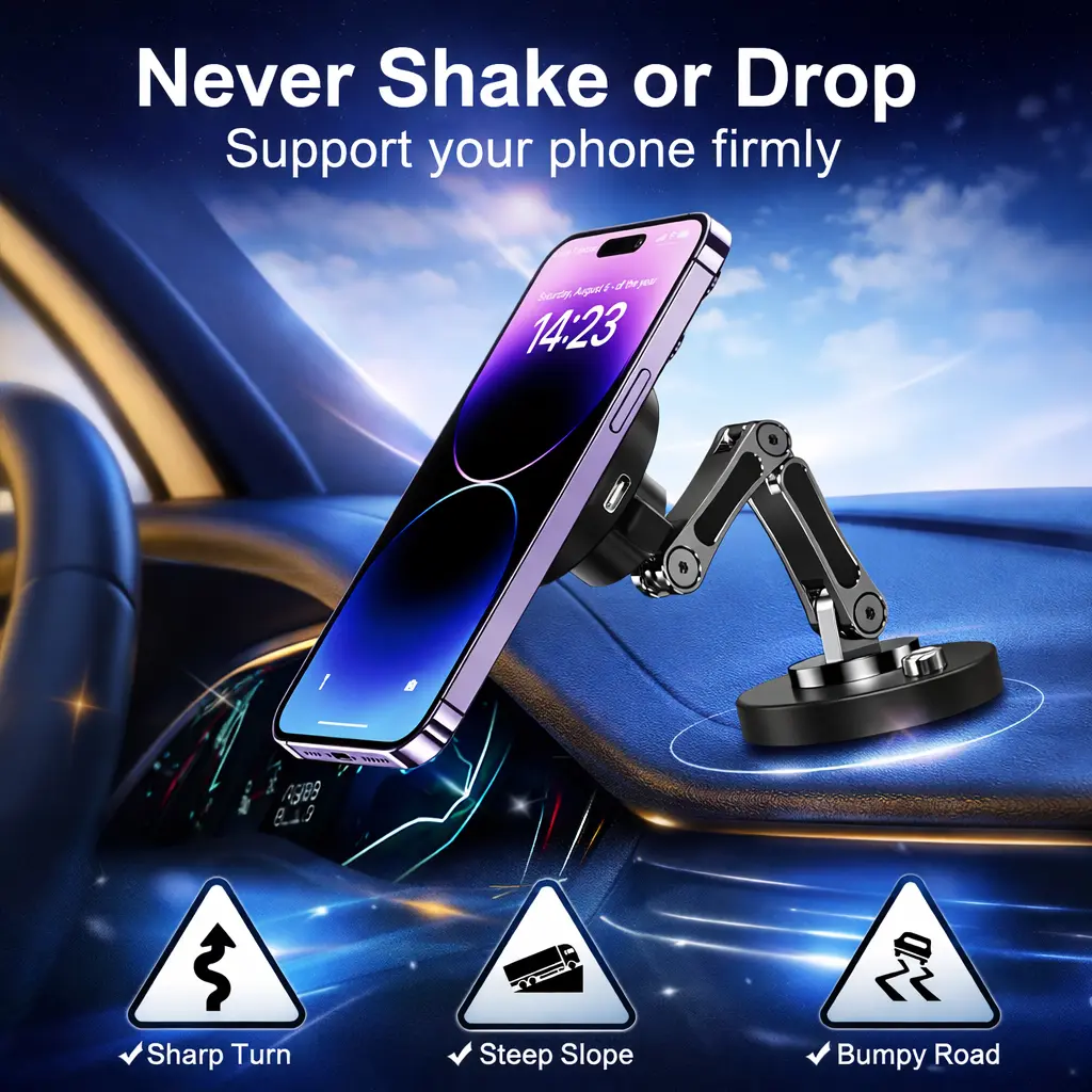 This wireless car charger mount combines a magnetic phone holder and fast wireless charger in one smart device. Just place your phone on the mount and the auto-clamping arms instantly secure it, keeping your device stable even on rough roads.