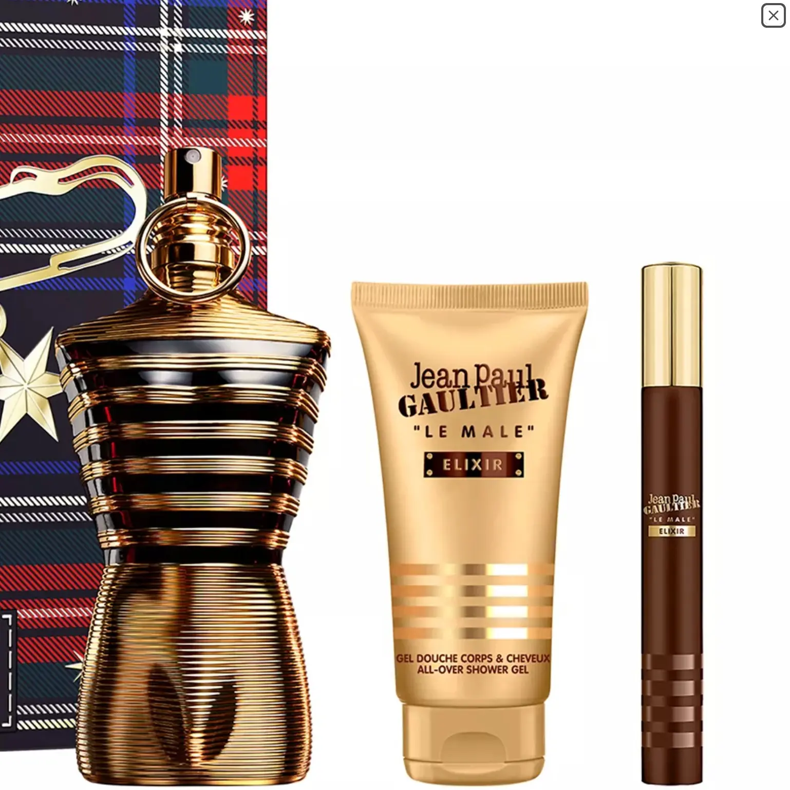 Le Male Elixir by Jean Paul Gaultier is a bold woody aromatic amber fragrance that delivers a warm and sensual scent experience. It opens with fresh and aromatic lavender that gives the fragrance a clean yet powerful start. The heart introduces rich tonka bean, adding a sweet, warm, and slightly tobbacco-like depth. As it settles, benzoin in the base creates a smooth resinous warmth that blends beautifully with hints of vanilla sweetness. The overall scent feels intense, masculine, and addictive, designed to last long and make a strong impression. This gift set includes a 4.2-oz parfum, a 2.6-oz all-over shower gel, and a 0.34-oz travel spray, making it perfect for daily use and travel.