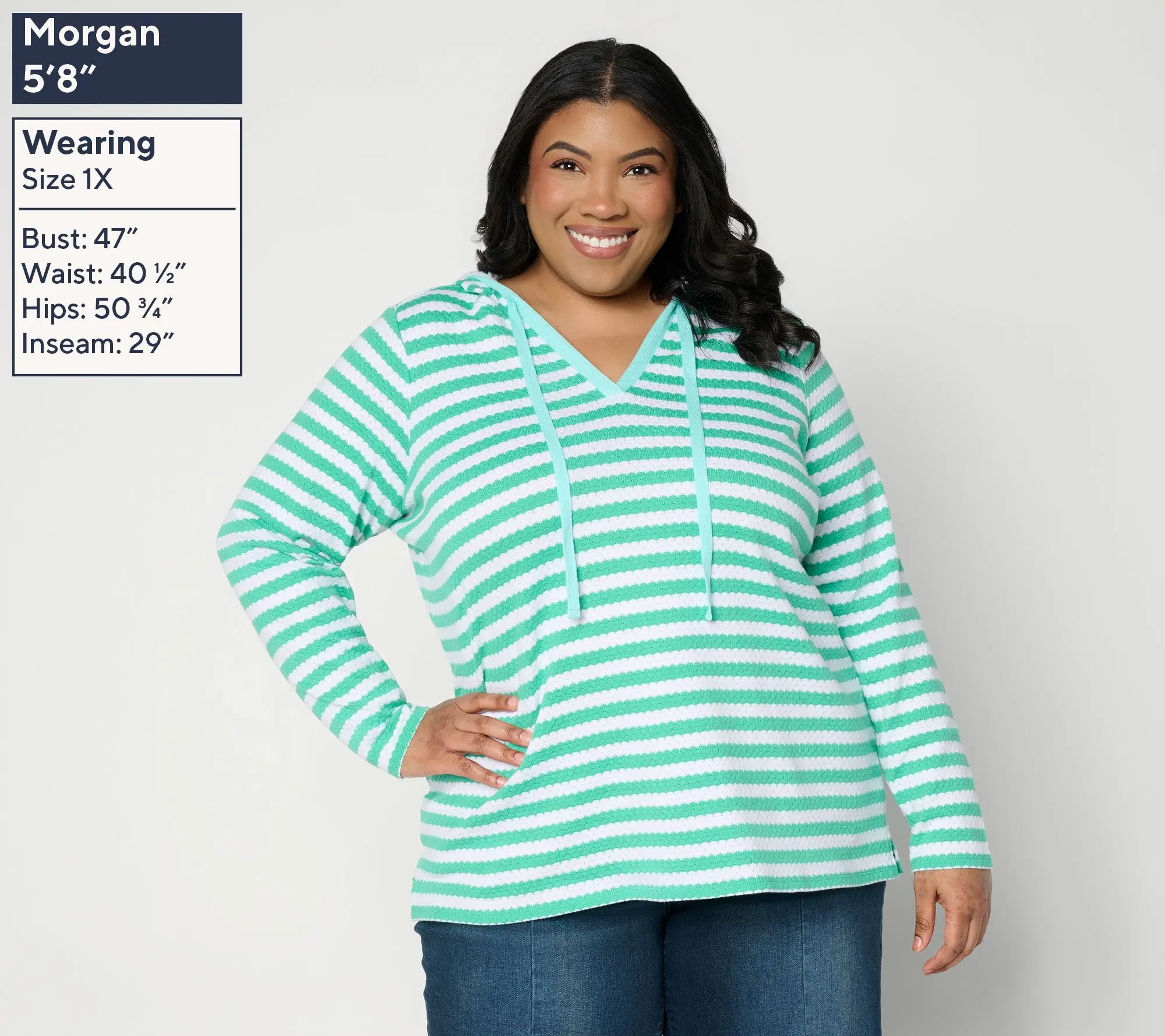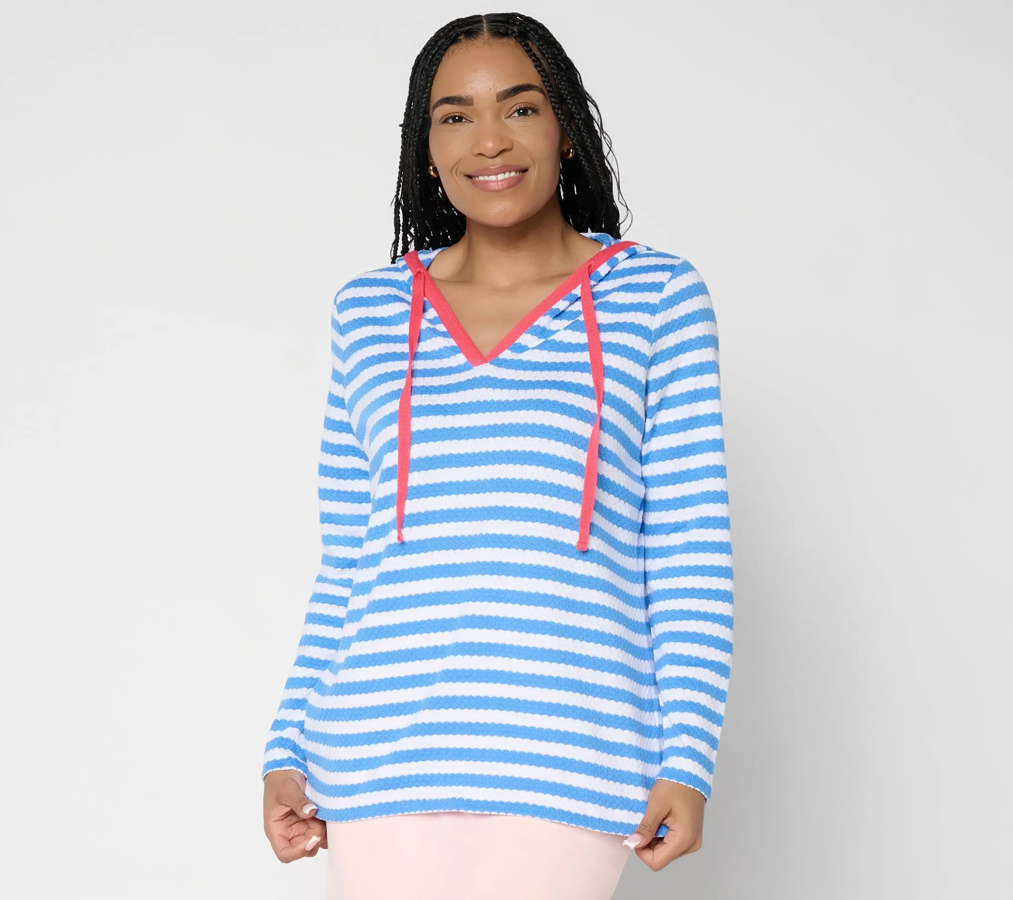 Belle Beach by Kim Gravel Nautical Knit Contrast Trim Stripe Hoodie. Long Sleeve Split neck stripe hoodie. Straight hem with side slits. Semi-fitted: follows the lines of the body with added wearing ease. Regular missy length : 26-1/2" - 28-5/8", Regular plus length : 29" - 32-1/2". Content : 60% cotton 40% polyester. Care : MWCDC/WS/ONCBWN/TDL/CIIN. COO: IMPORT