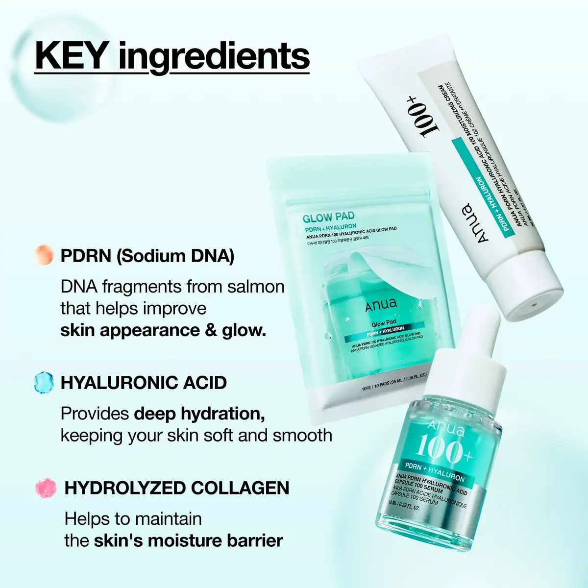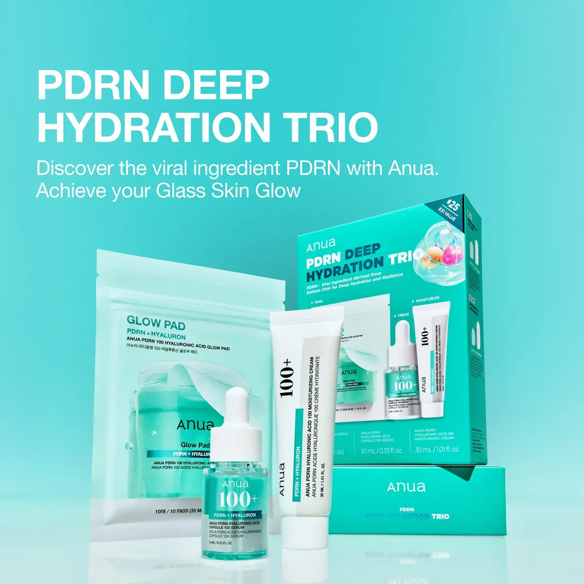 The Anua PDRN Deep Hydration Trio is a 3-step trial kit featuring a toner pad, serum, and moisturizer to help you achieve a glass-skin glow powered by the viral ingredient, PDRN.