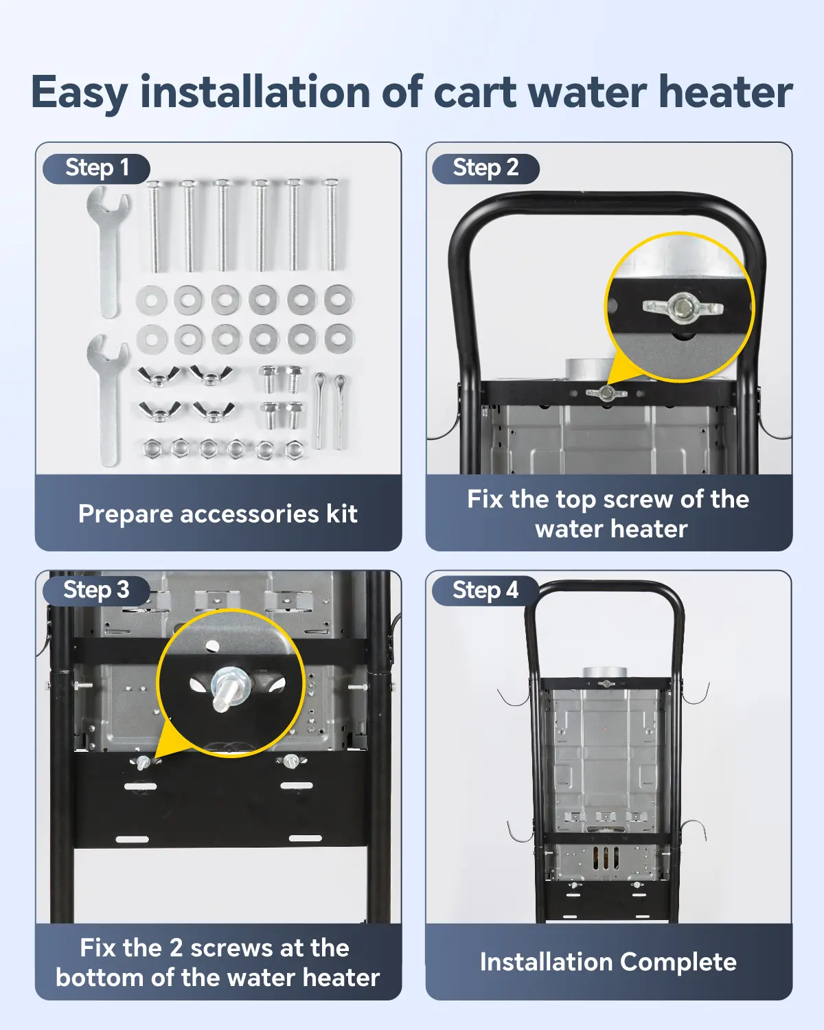 Mobile Hot Water Cleaning Station: Specifically designed for portable water heaters. It combines the water heater, gas bottle, and water tank, providing more convenient hot water for your campsite, stable, yard, or farm.