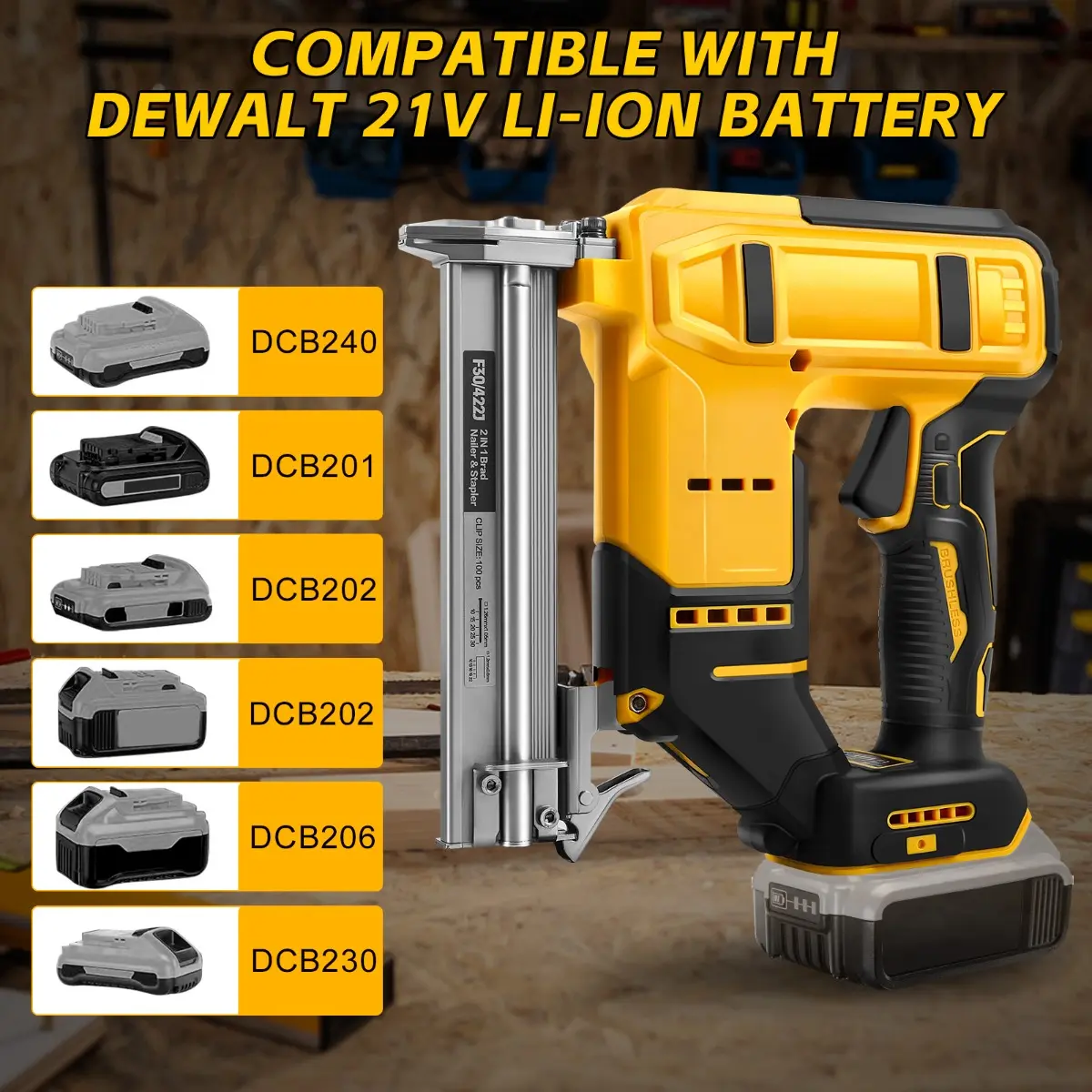 The 18GA Cordless Brad Nailer is compatible with DeWalt 20V MAX Battery. It's a 2-in-1 nail & staple gun, perfect for trim, woodworking, and DIY projects. Comes with 2000 nails for versatile use. This tool is ideal for those needing a versatile nailer for various tasks.