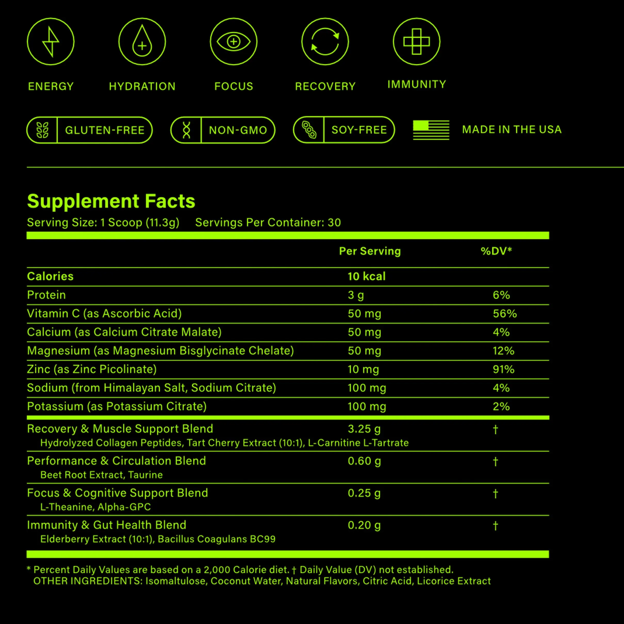 ·Recovery + Soft-Tissue Health – Collagen peptides, vitamin C, and zinc support tendon, ligament, and connective-tissue health.
