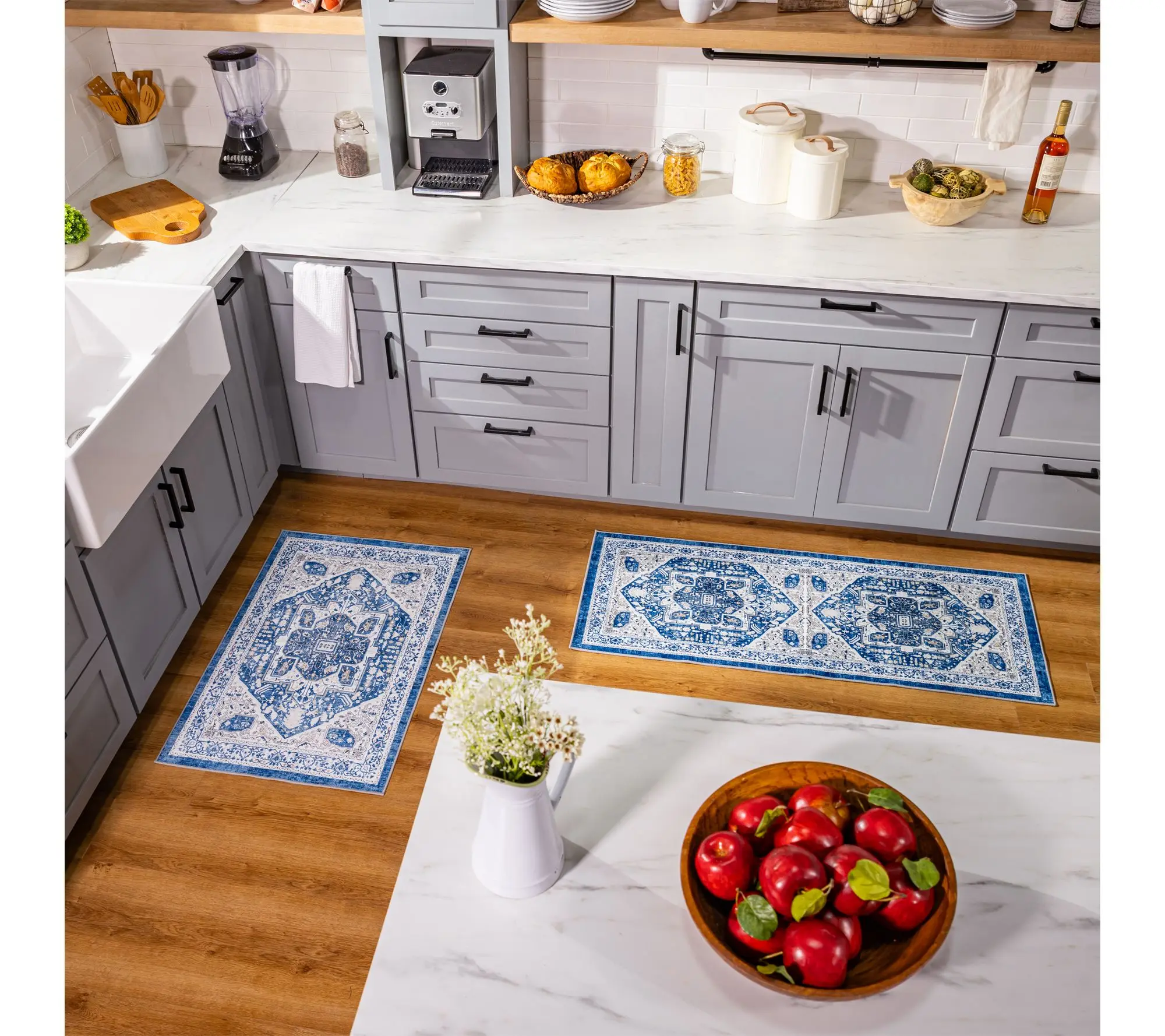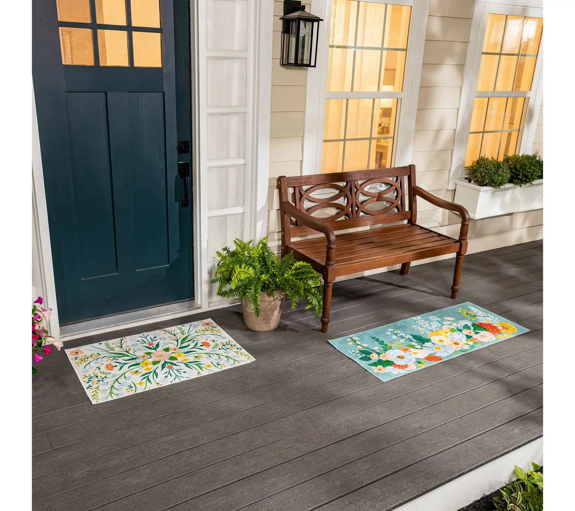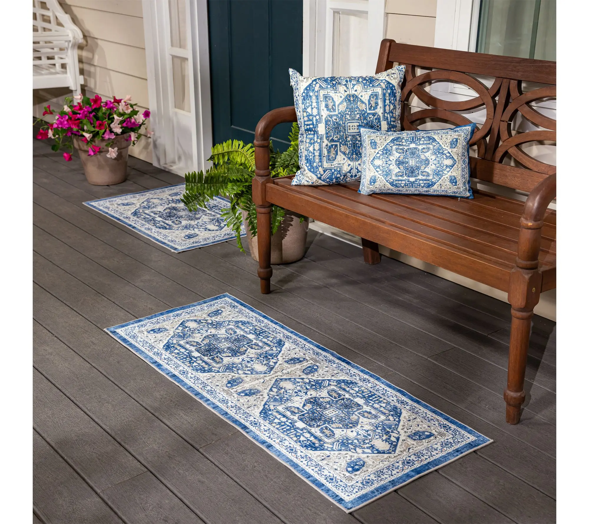 These durable Polyester indoor runners and mats ideal for use in entryways, hallways, or as a decorative accent. They are made of Polyester with a TPE backing, and are available in two color choices, Multi Floral or Blue. The set consists of a runner, 50.5" x 20.25", and a mat, 36.5" x 24.25", and are for indoor or covered porch use. They can be easily cleaned either by hand or by machine with mild soap and cold water. No bleach. Air dry flat. Do not machine dry.