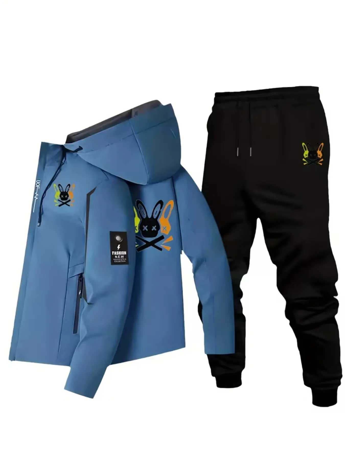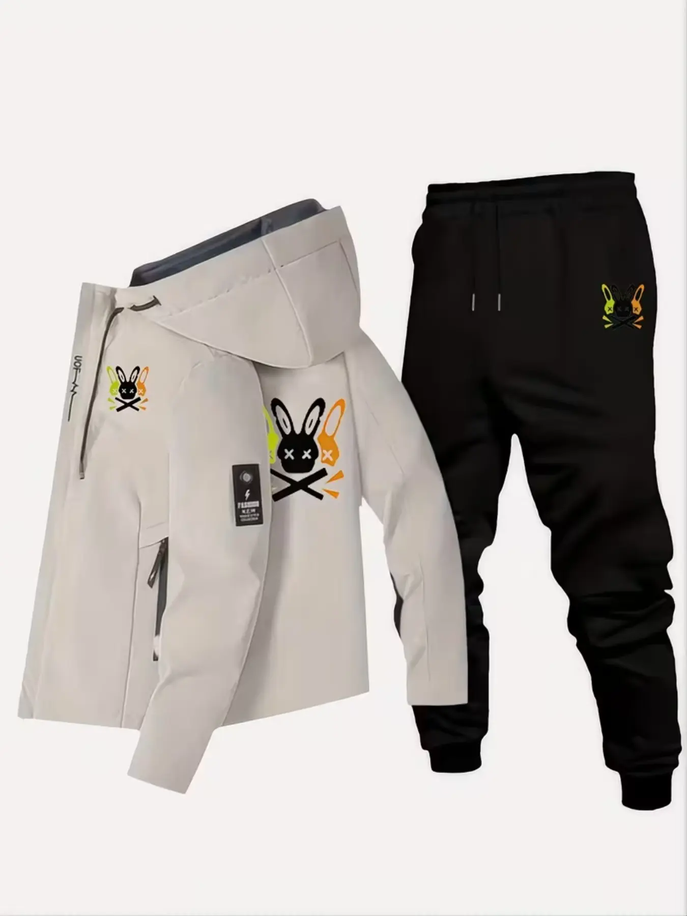 Men's Casual Rabbit Print Outdoor Jacket Set, Camping Hiking Fitness Daily Commute Breathable Durable Mountain Wear