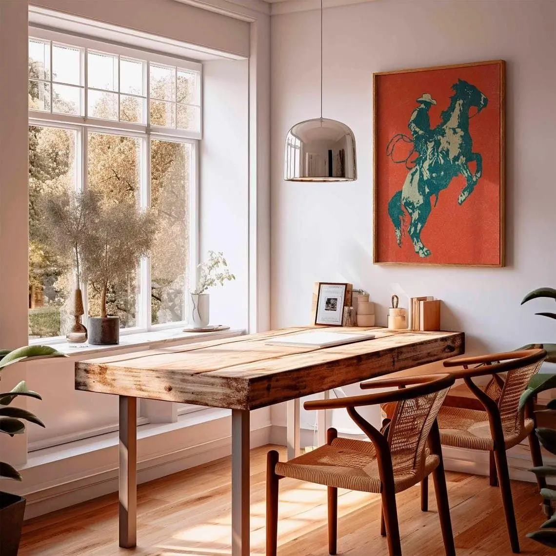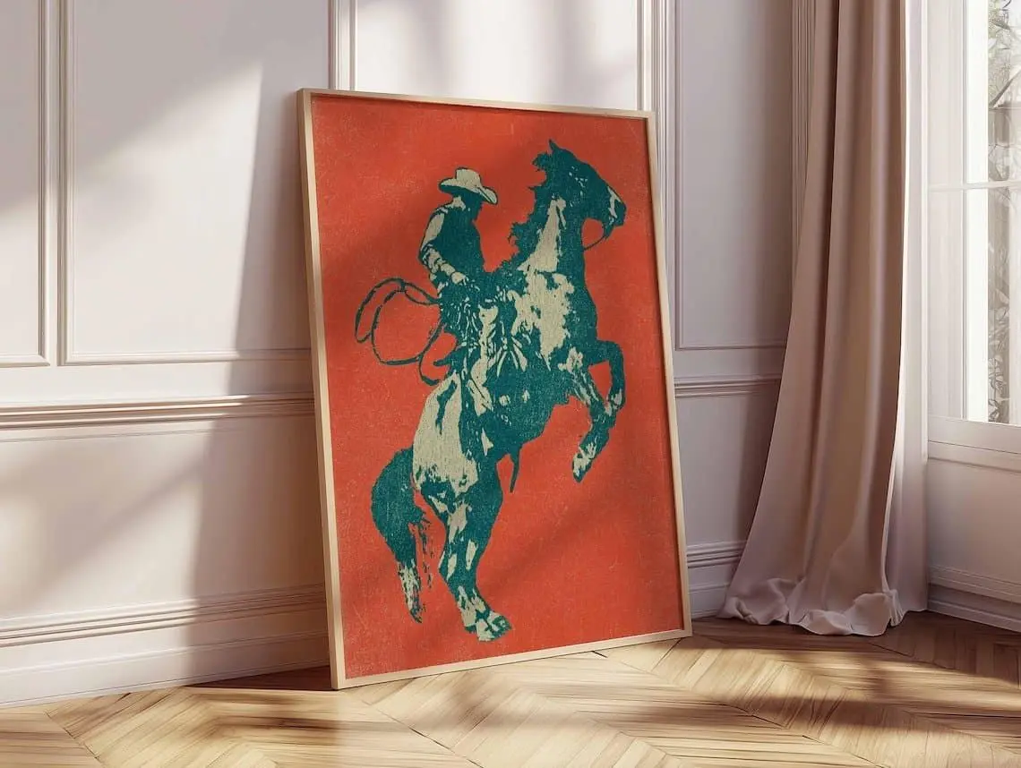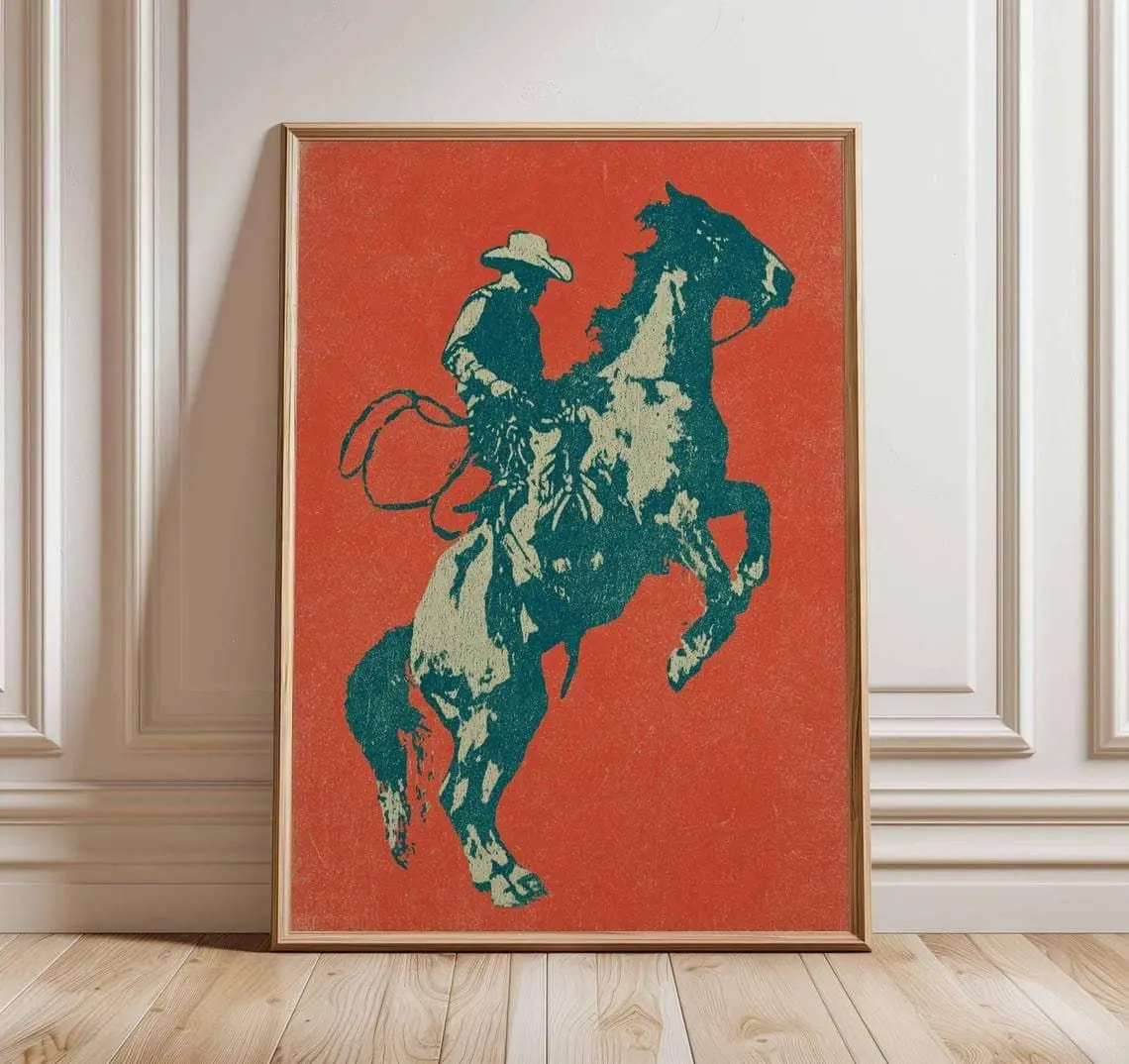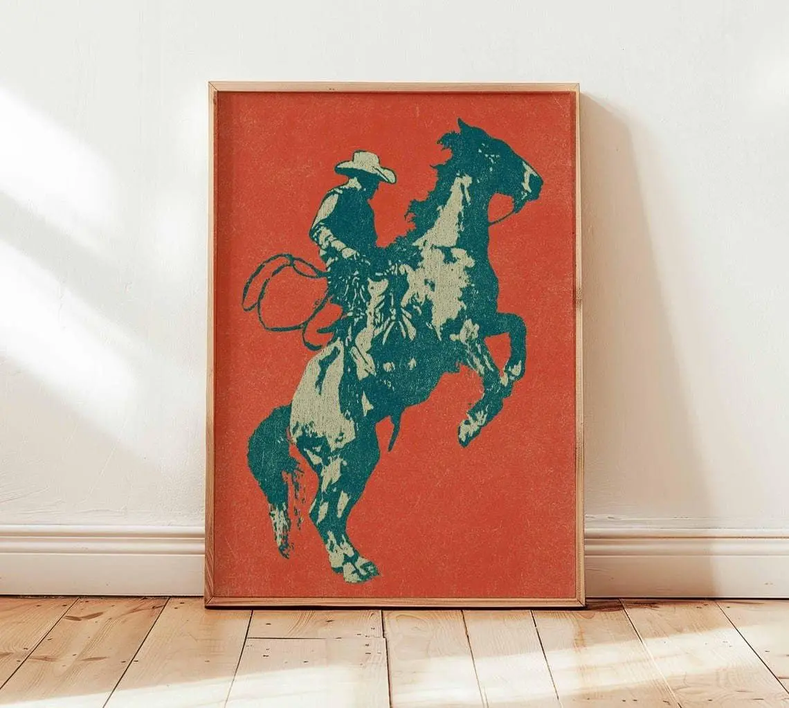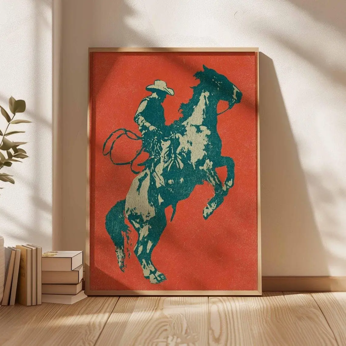 5. [Sale off up to 50%] [Free ship] [No Frame] Cowboy Poster, Western Wall Art, Rustic Horse Rider Print, Vintage Rodeo Decor, Bold Red Minimal Design, Americana Country Artwork