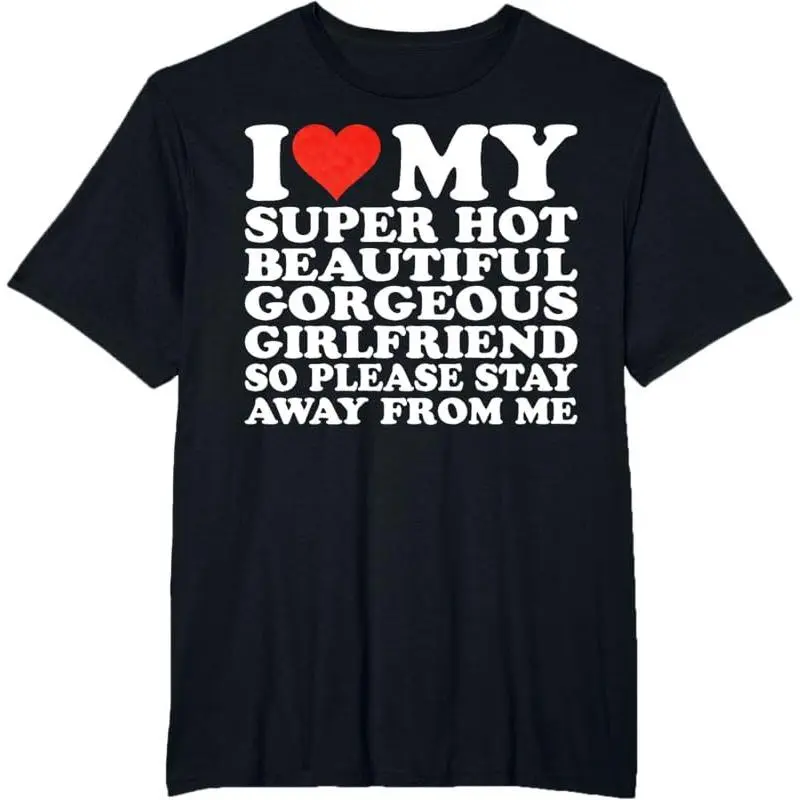 Cotton short sleeve T-shirt featuring the bold statement, "I love my super hot beautiful gorgeous girlfriend."Please stay away from me.This T-shirt is perfect for expressing your feelings.It's a lightweight, classic fit with double-needle sleeve and bottom hem.Ideal for casual wear.
